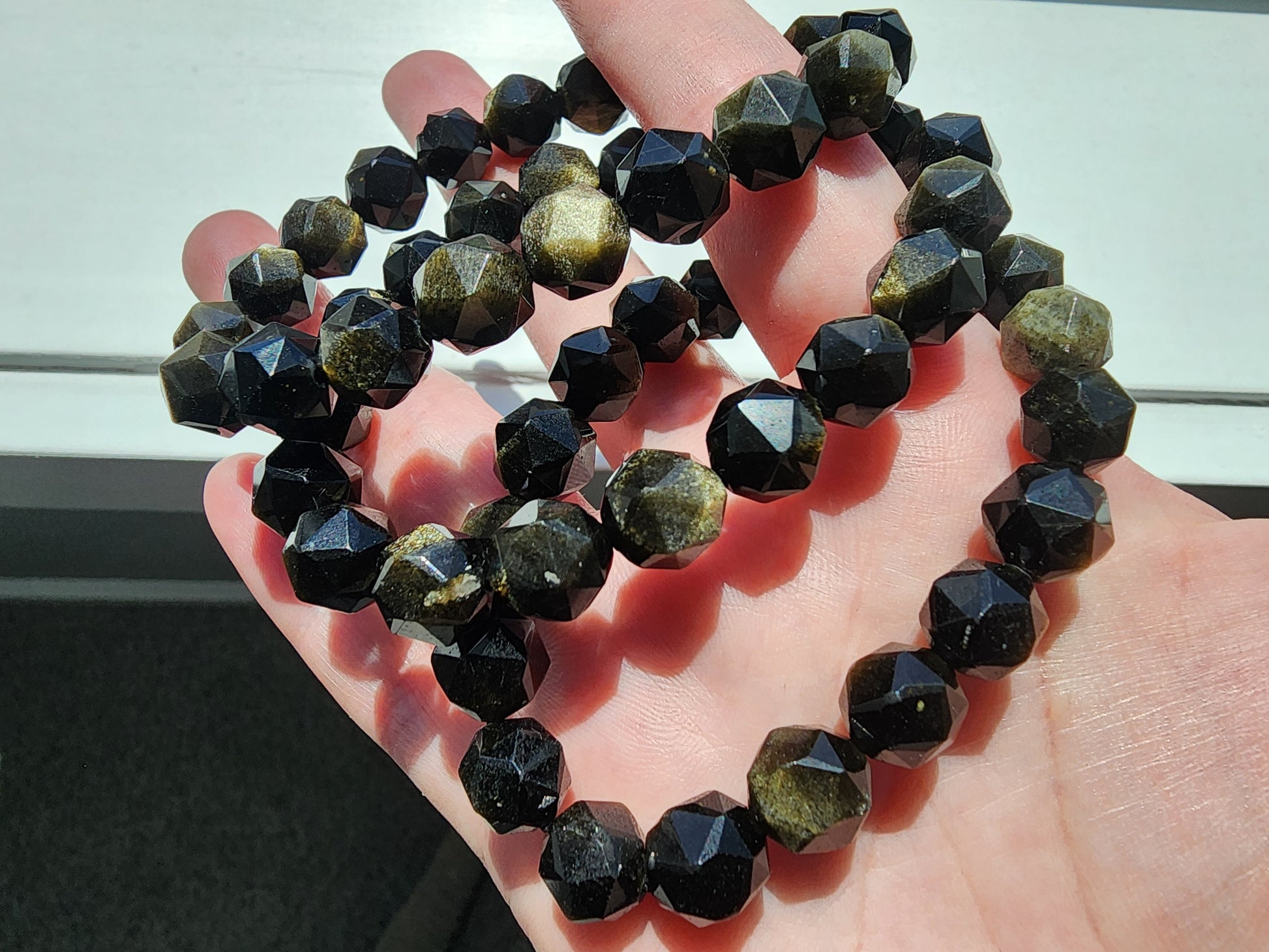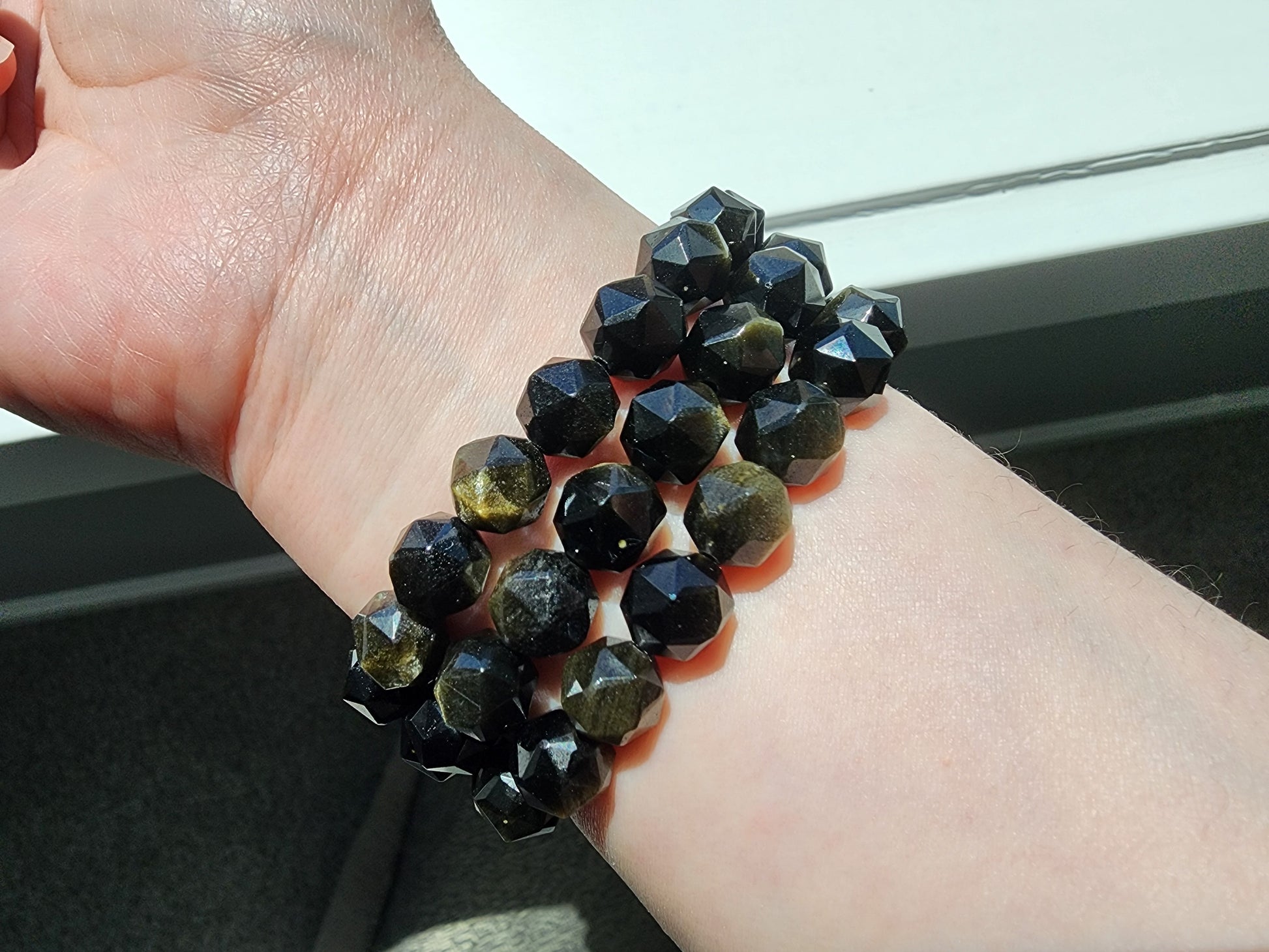 Please note that each 10mm Faceted Gold Sheen Obsidian bracelet is crafted from natural stones, which may feature slight variations in color, sheen, and surface texture, making each piece truly unique. These natural characteristics are not imperfections but rather add to the distinct beauty and individuality of each bracelet. Additionally, the faceted cut enhances the stone's natural sparkle, but minor surface irregularities may occur due to the hand-cutting process. We appreciate your understanding and hope you enjoy the one-of-a-kind nature of your bracelet.
