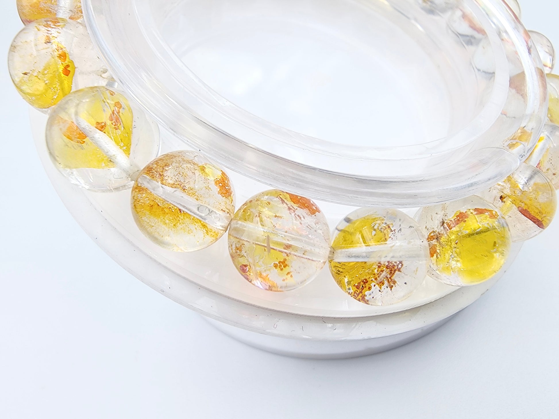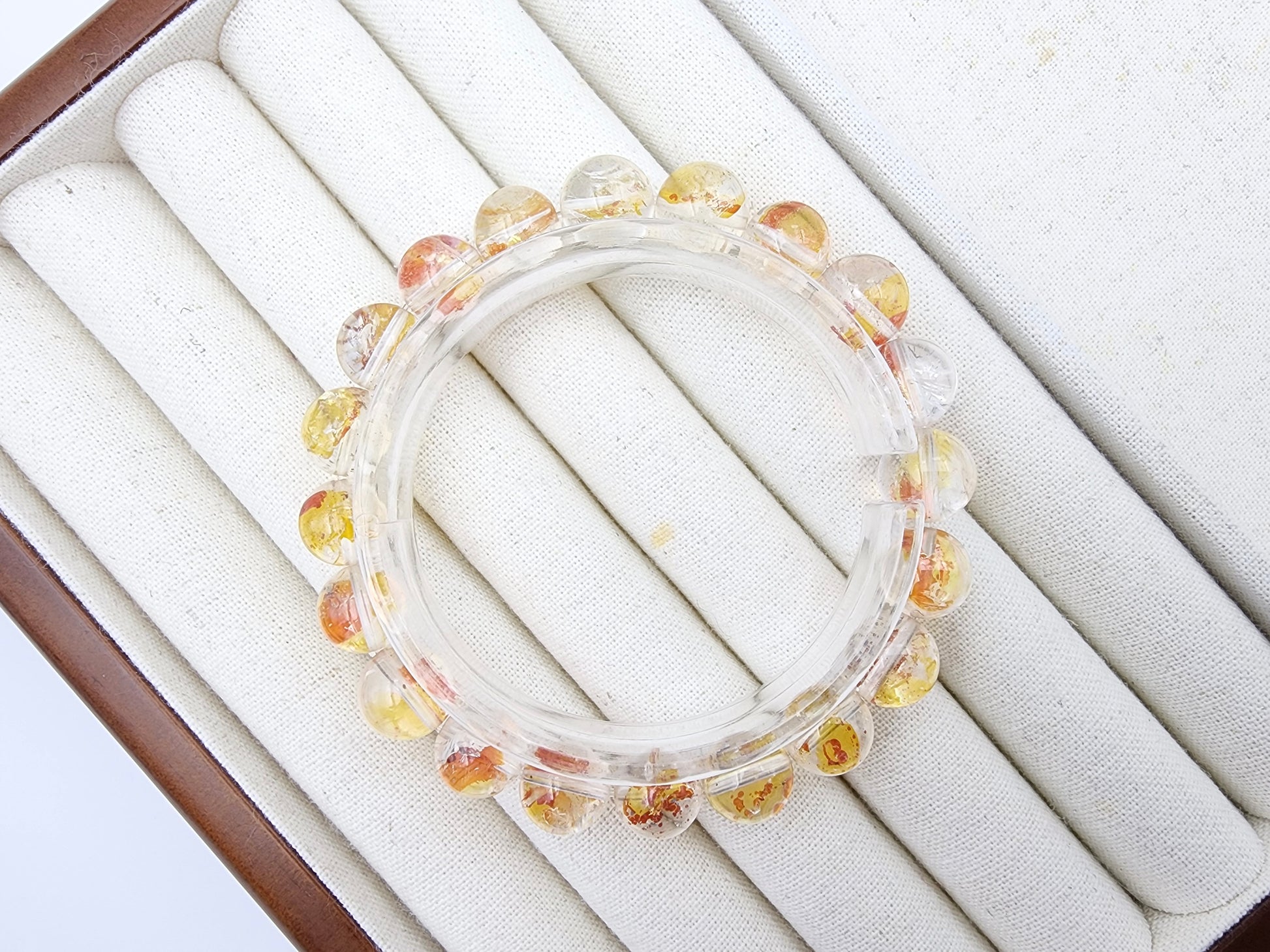 This Koi Hematoid Quartz bracelet features clear quartz beads with stunning red and yellow inclusions that resemble the graceful patterns of koi fish swimming through water. Each bead showcases unique “gel-like” blooms—natural formations of iron oxide that give the bracelet a vibrant, painterly look. The interplay of fiery tones and crystal clarity creates a sense of movement and warmth, making it not only a beautiful accessory but also a symbol of luck, vitality, and transformation. Whether worn alone or layered, this bracelet adds a touch of color and positive energy to any look.
