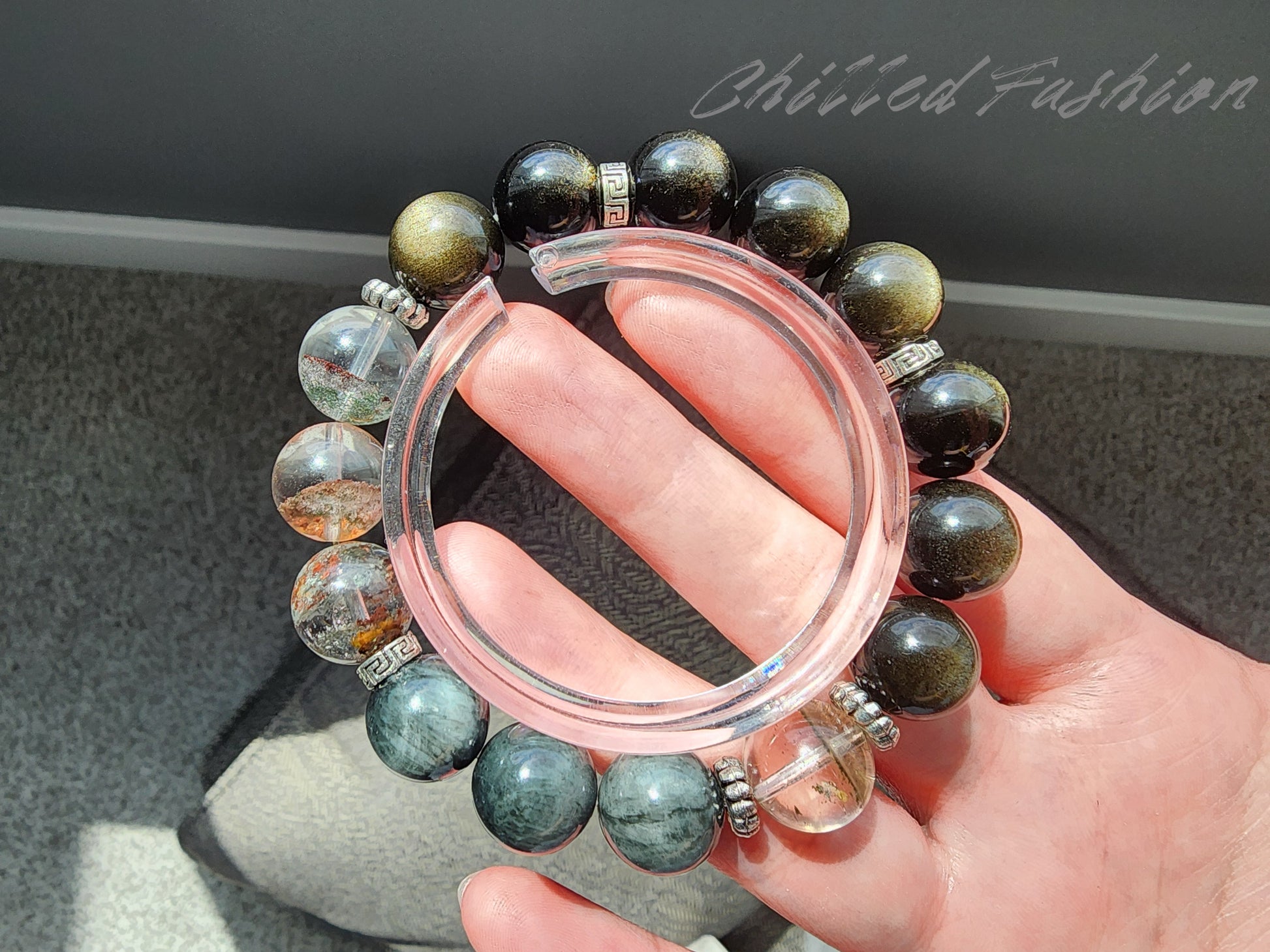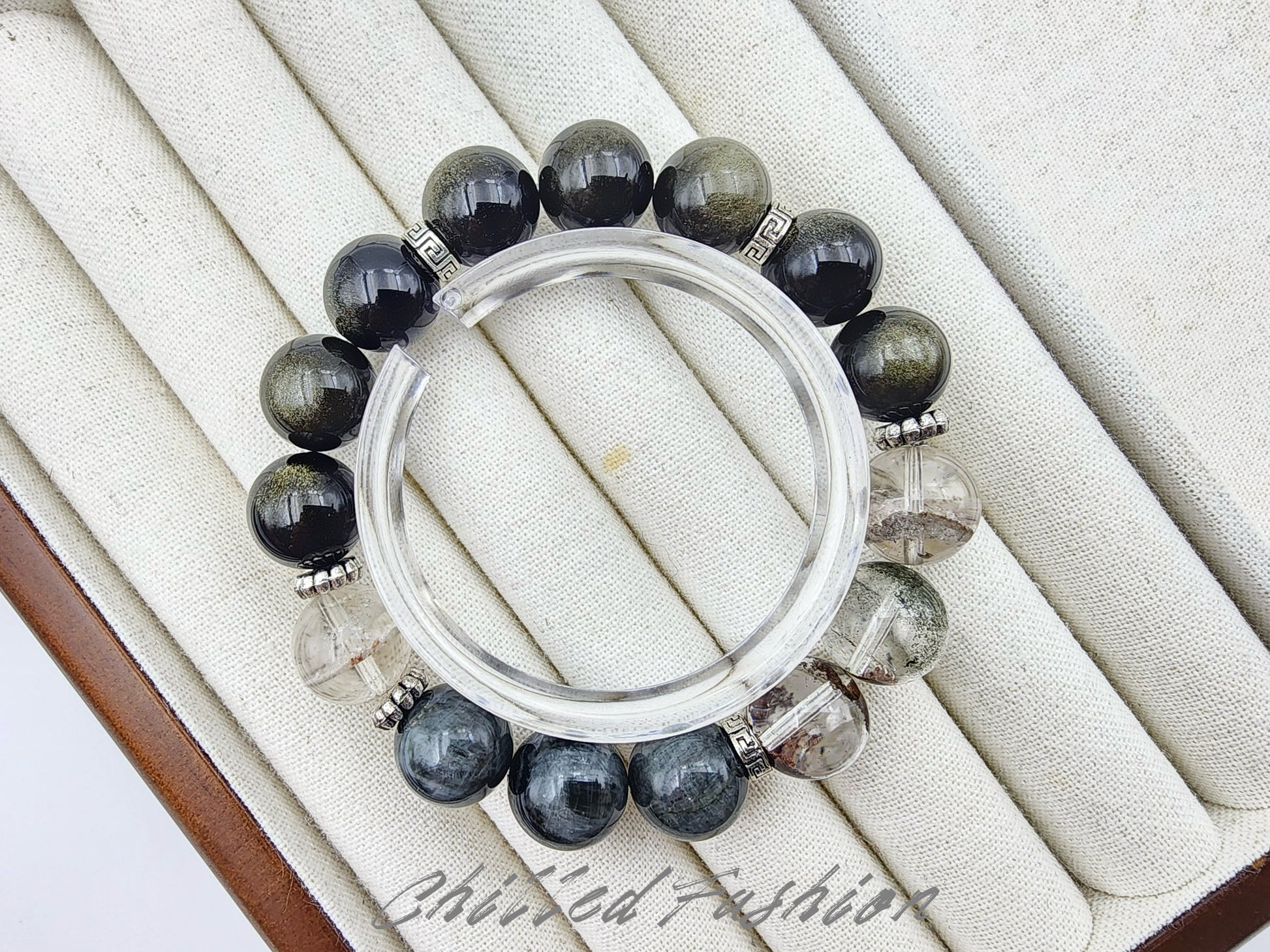 This bracelet features a powerful trio of natural stones—gray-toned Hawk’s Eye with its soft, reflective sheen, shimmering Gold Sheen Obsidian with metallic golden undertones, and translucent Phantom Quartz containing delicate mineral inclusions. Known for enhancing focus and clear thinking, Hawk’s Eye is often associated with grounding and protection. Gold Sheen Obsidian is prized for shielding energy and revealing hidden truths, while Phantom Quartz is believed to support growth and transformation. Together, these stones create a bracelet that not only makes a bold visual statement but also supports mental clarity and inner strength—ideal for everyday grounding and intention setting.