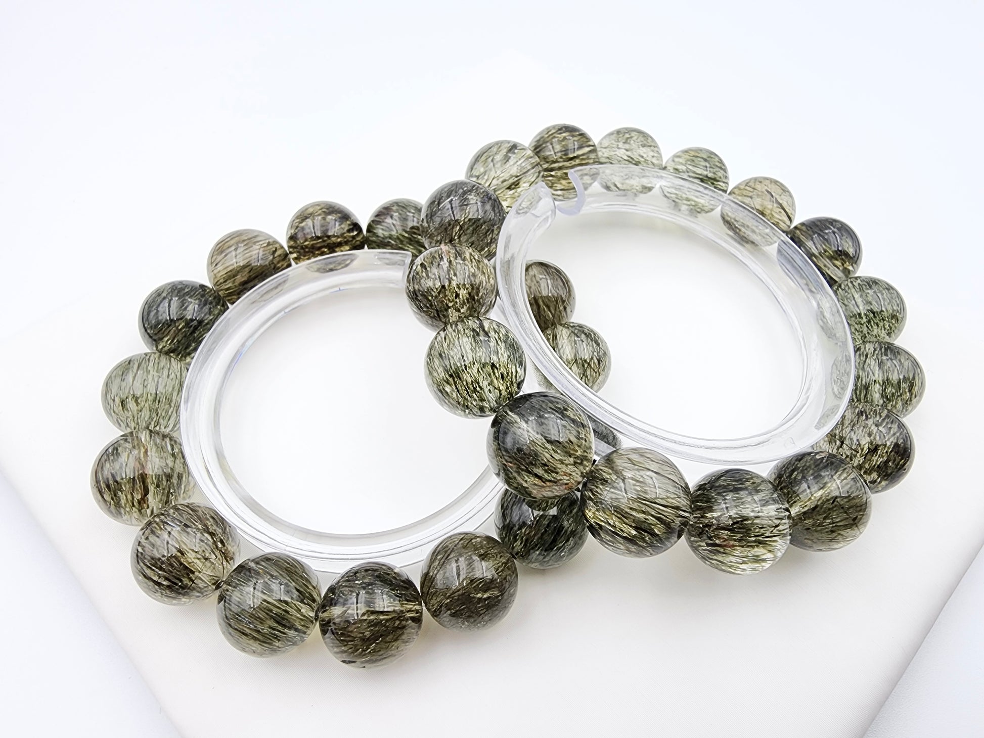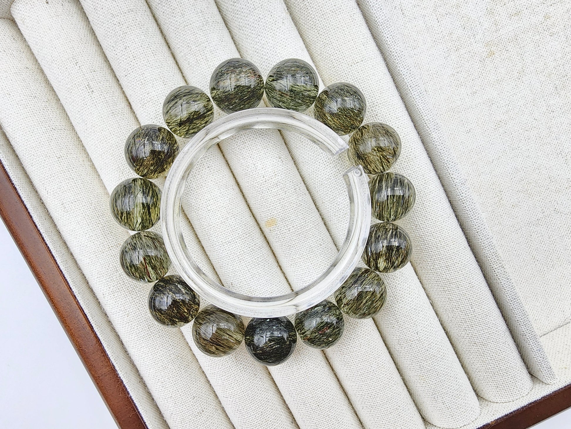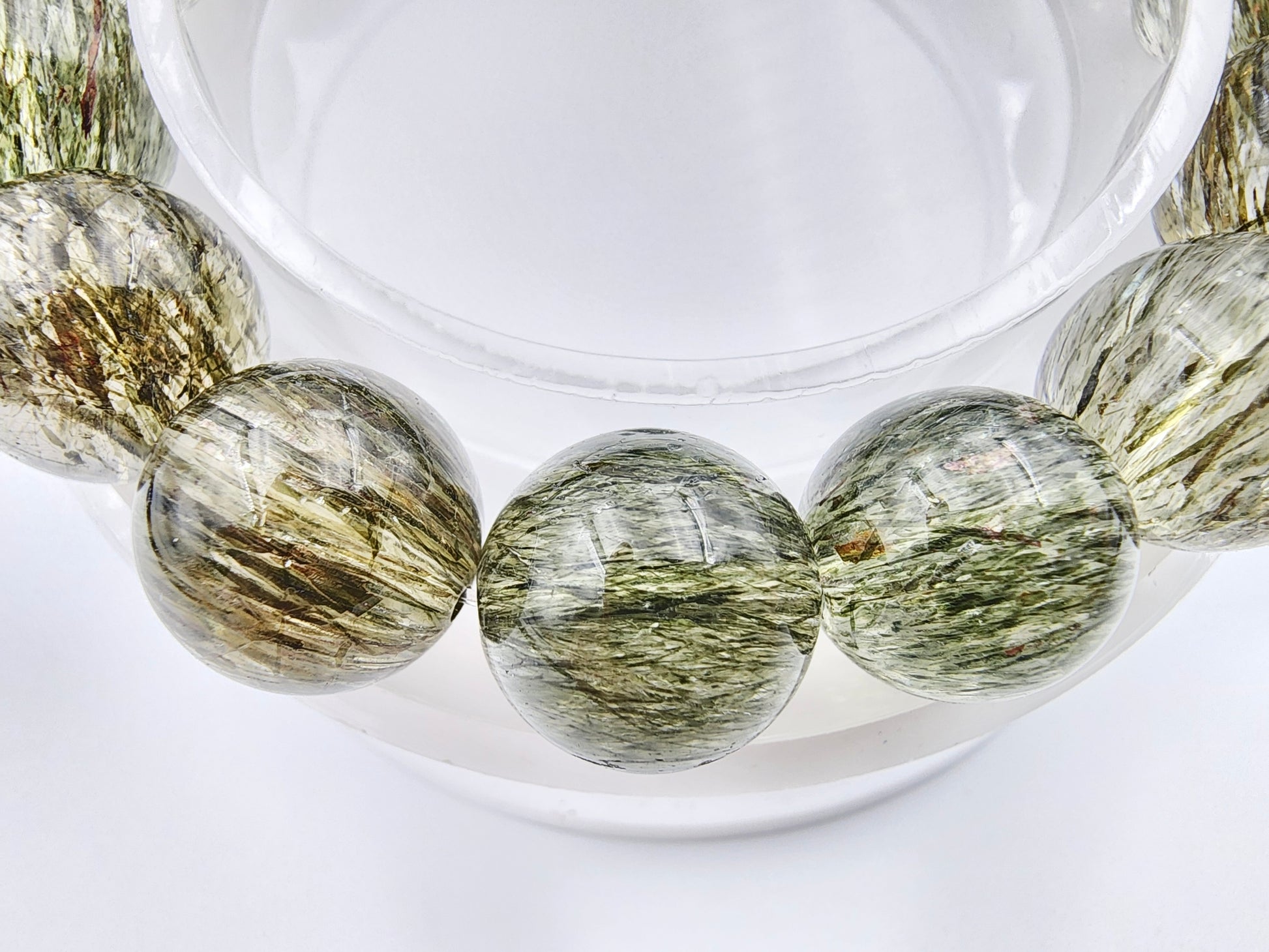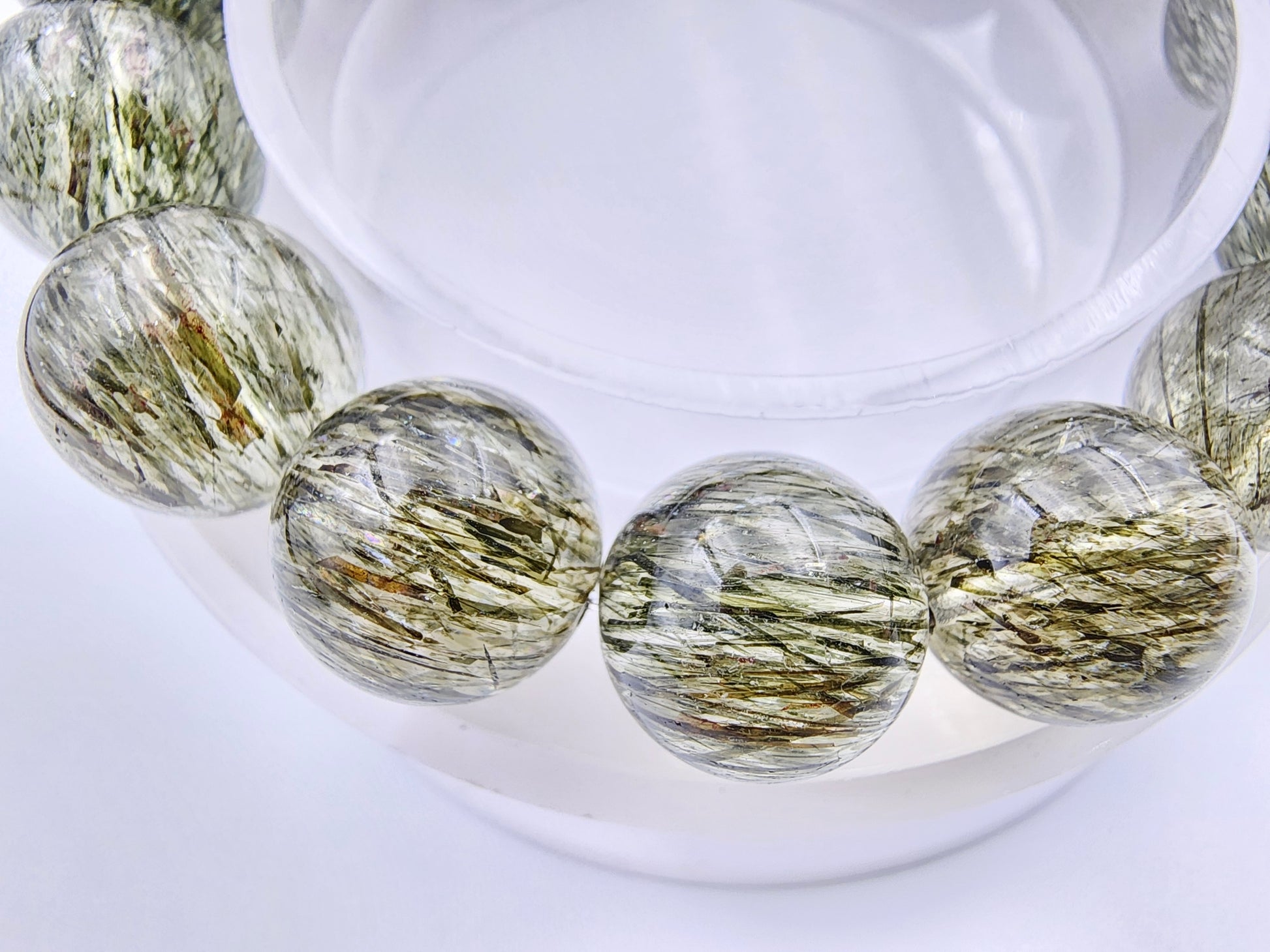 [Bracelet] 13mm Quartz Crystal Bracelet with Rutile-Like Green Tourmaline Inclusions