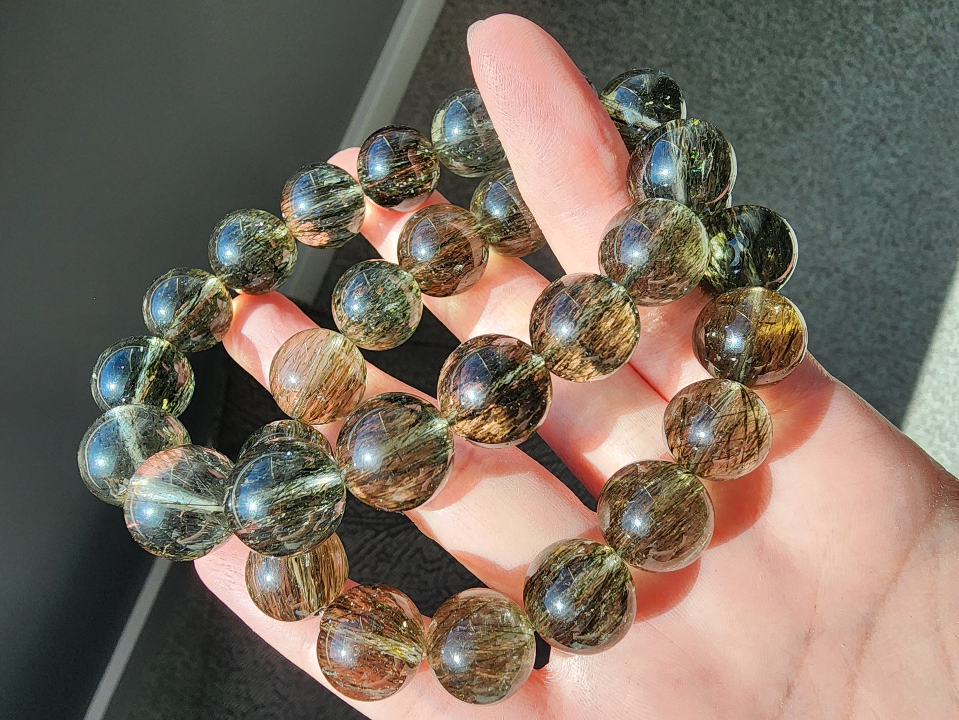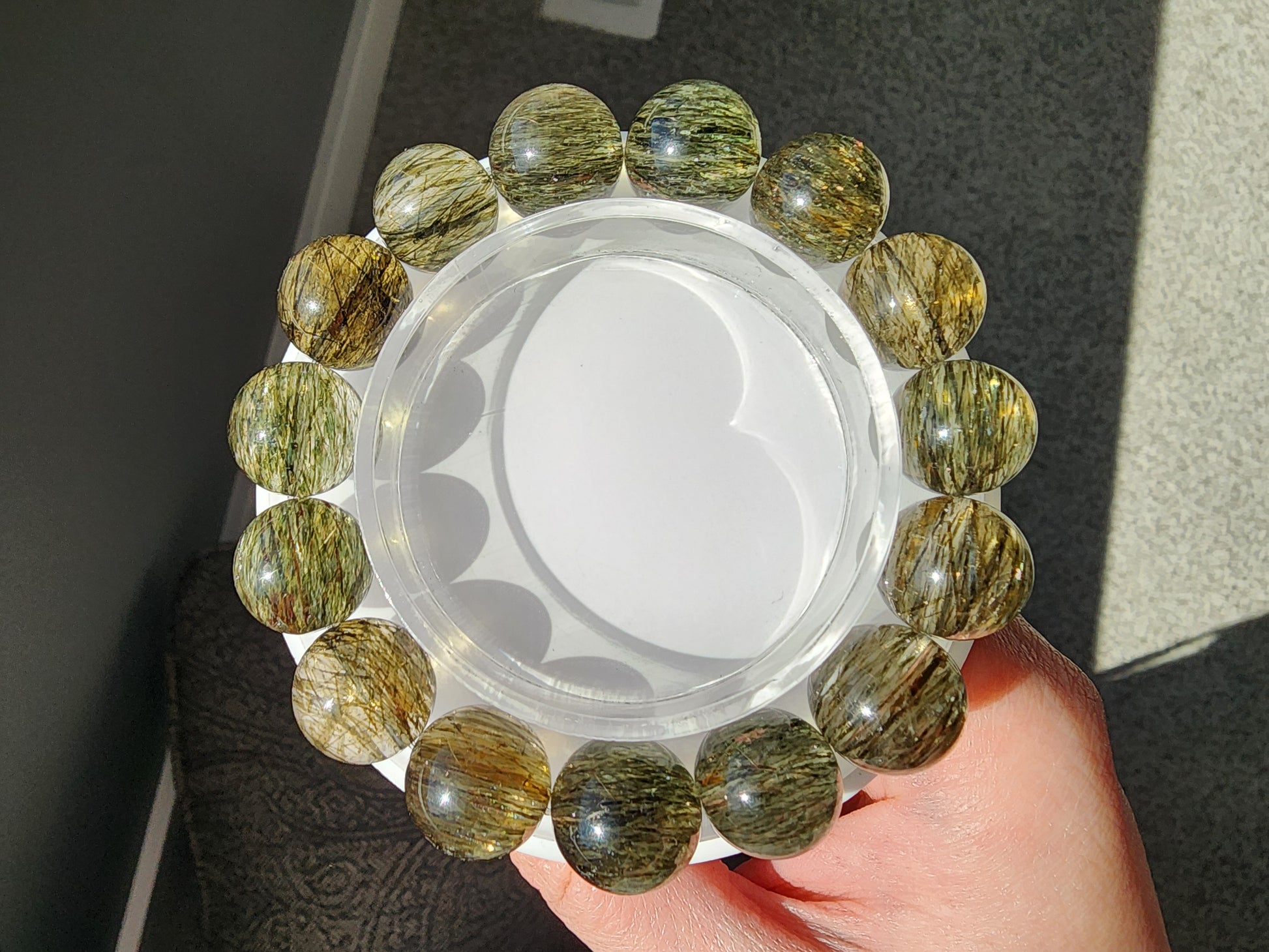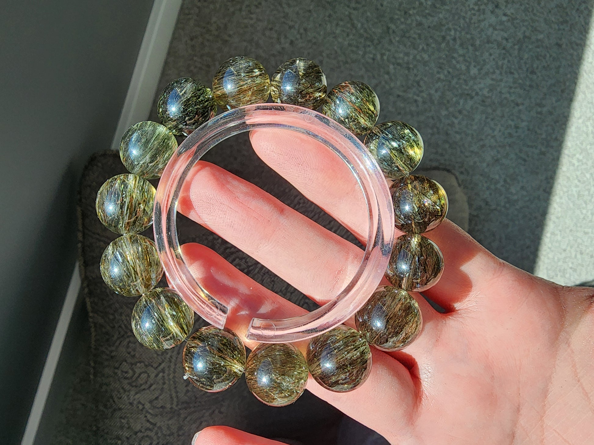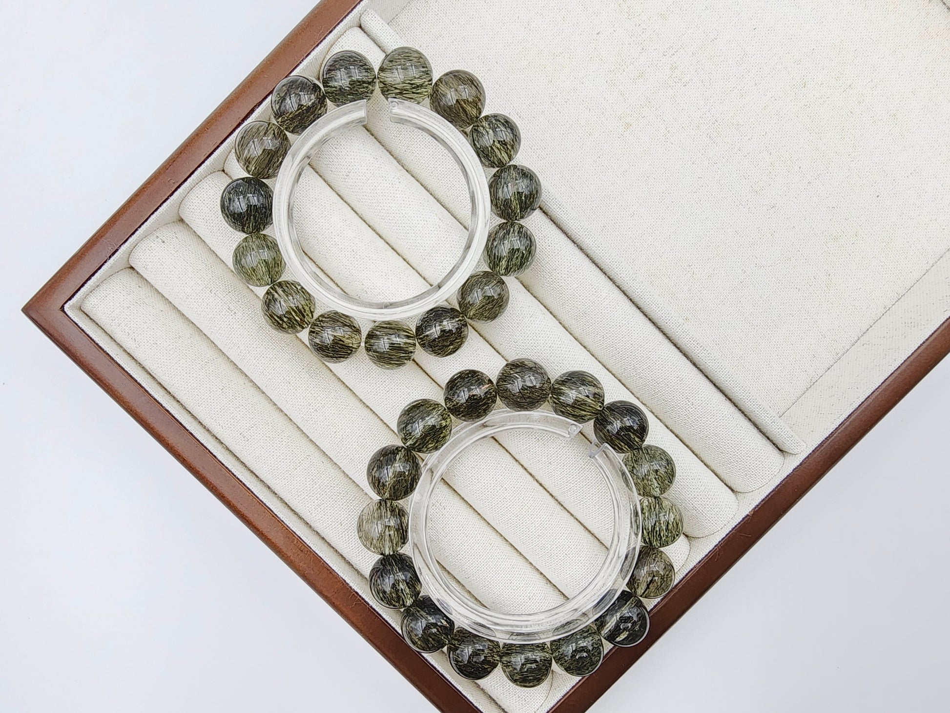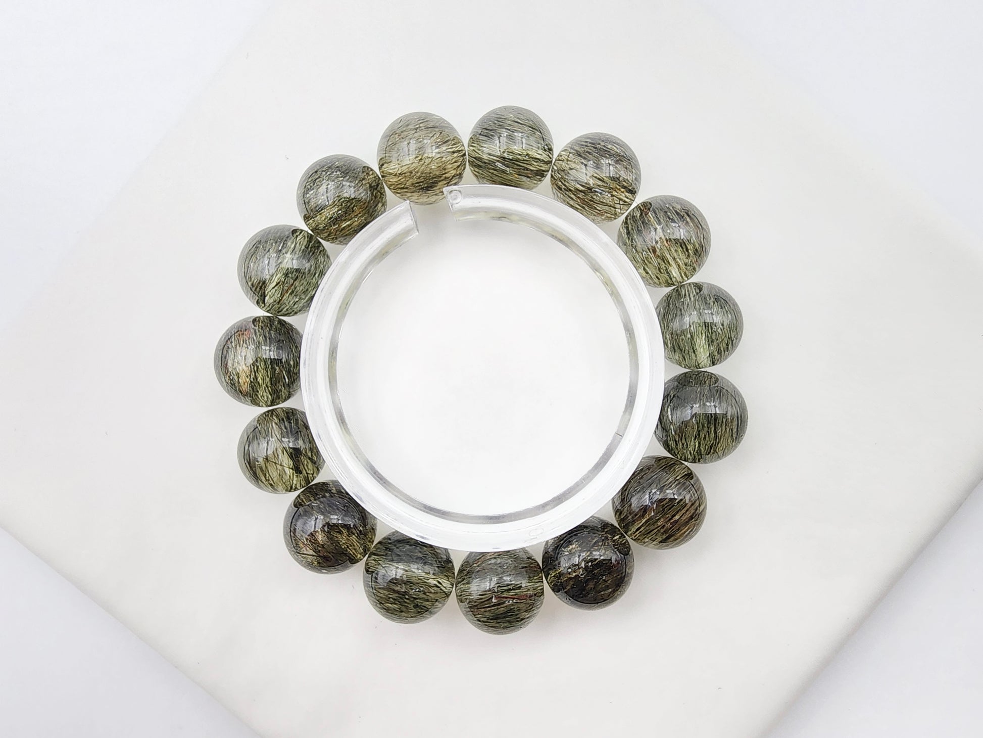 [Bracelet] 13mm Quartz Crystal Bracelet with Rutile-Like Green Tourmaline Inclusions