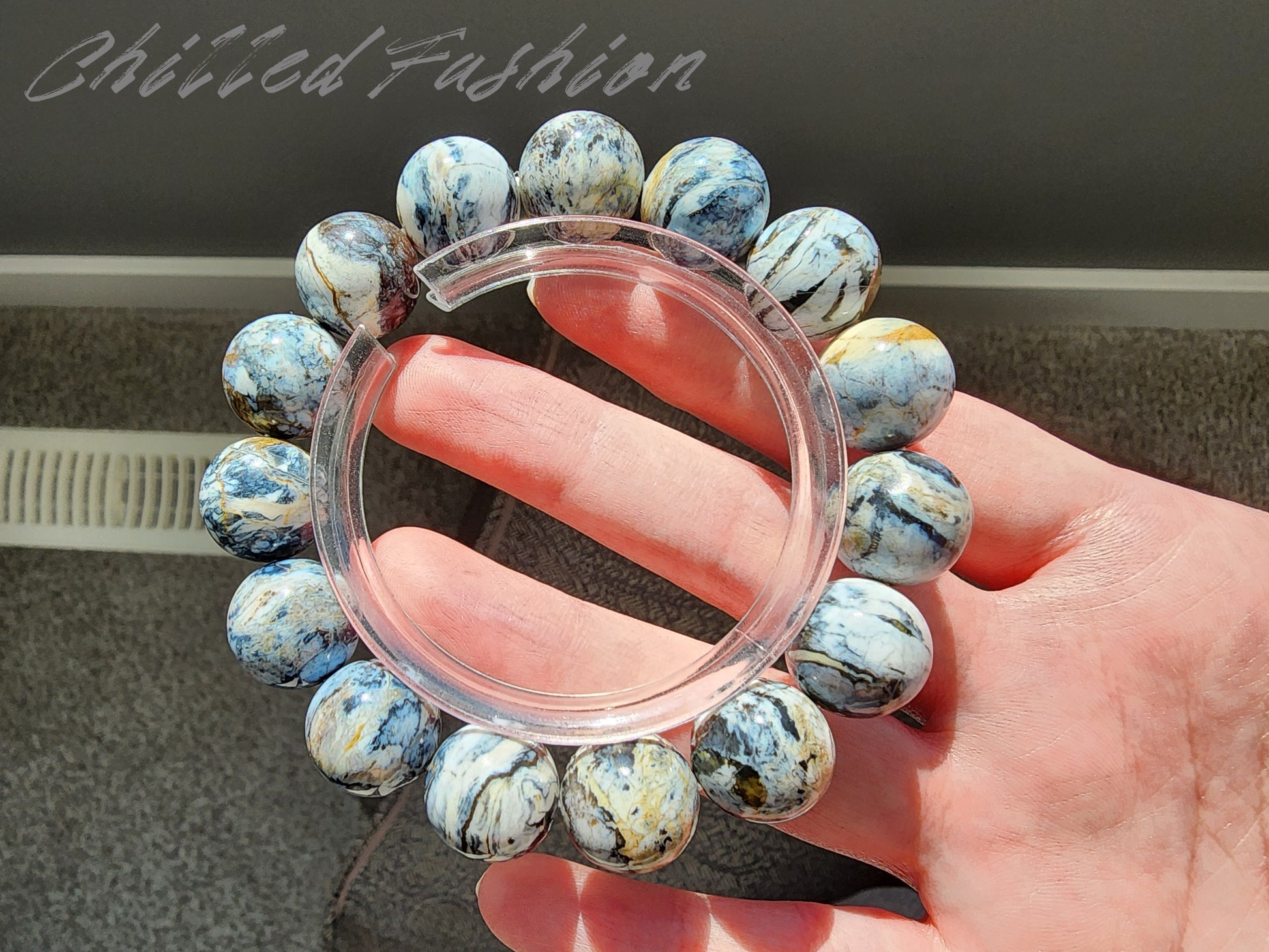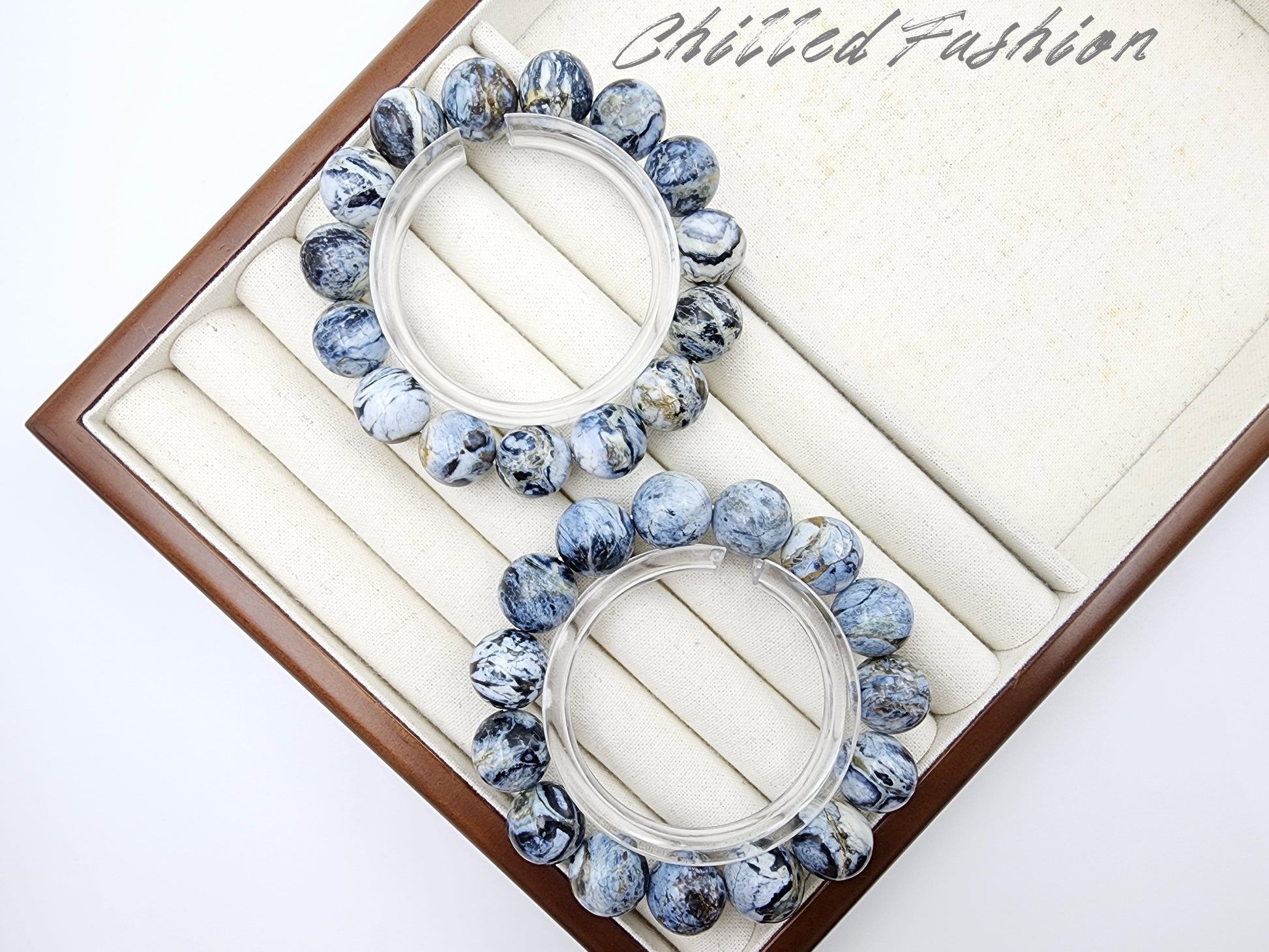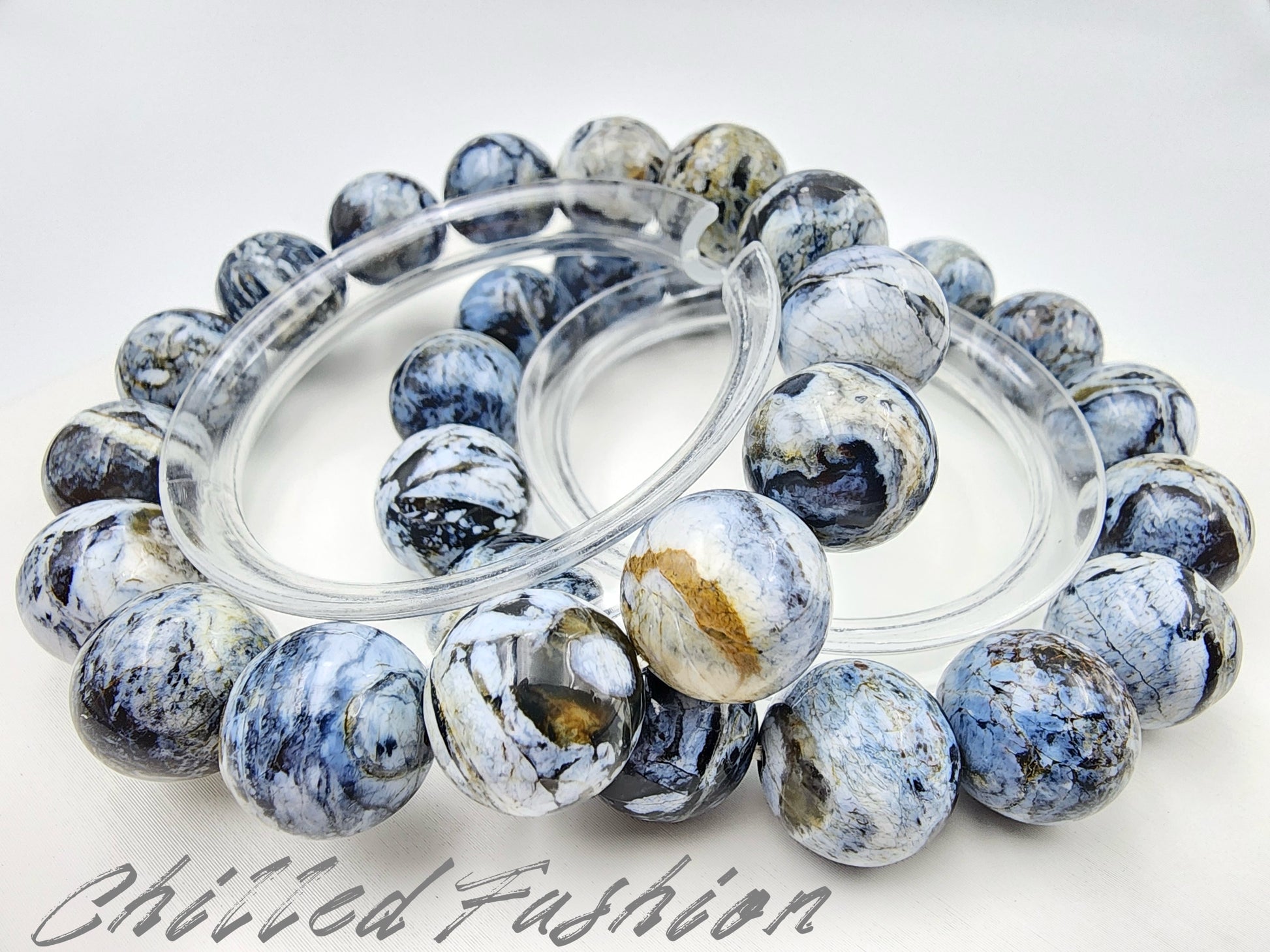 These Blue Opal bracelets feature natural gemstone beads with mesmerizing swirls of denim blue, stormy gray, and soft ivory, each bead reflecting the raw beauty of nature's artistry. Often associated with emotional clarity, intuition, and gentle transformation, Blue Opal is treasured by those drawn to its calming and reflective energy. The marbled patterns and cool tones evoke a sense of serenity, making each bracelet a meaningful symbol of inner peace and quiet strength. Whether worn for its distinctive look or deeper symbolic value, this unisex piece makes a thoughtful gift and a timeless addition to any crystal jewelry collection.