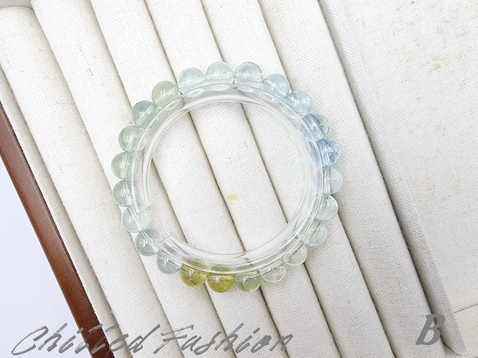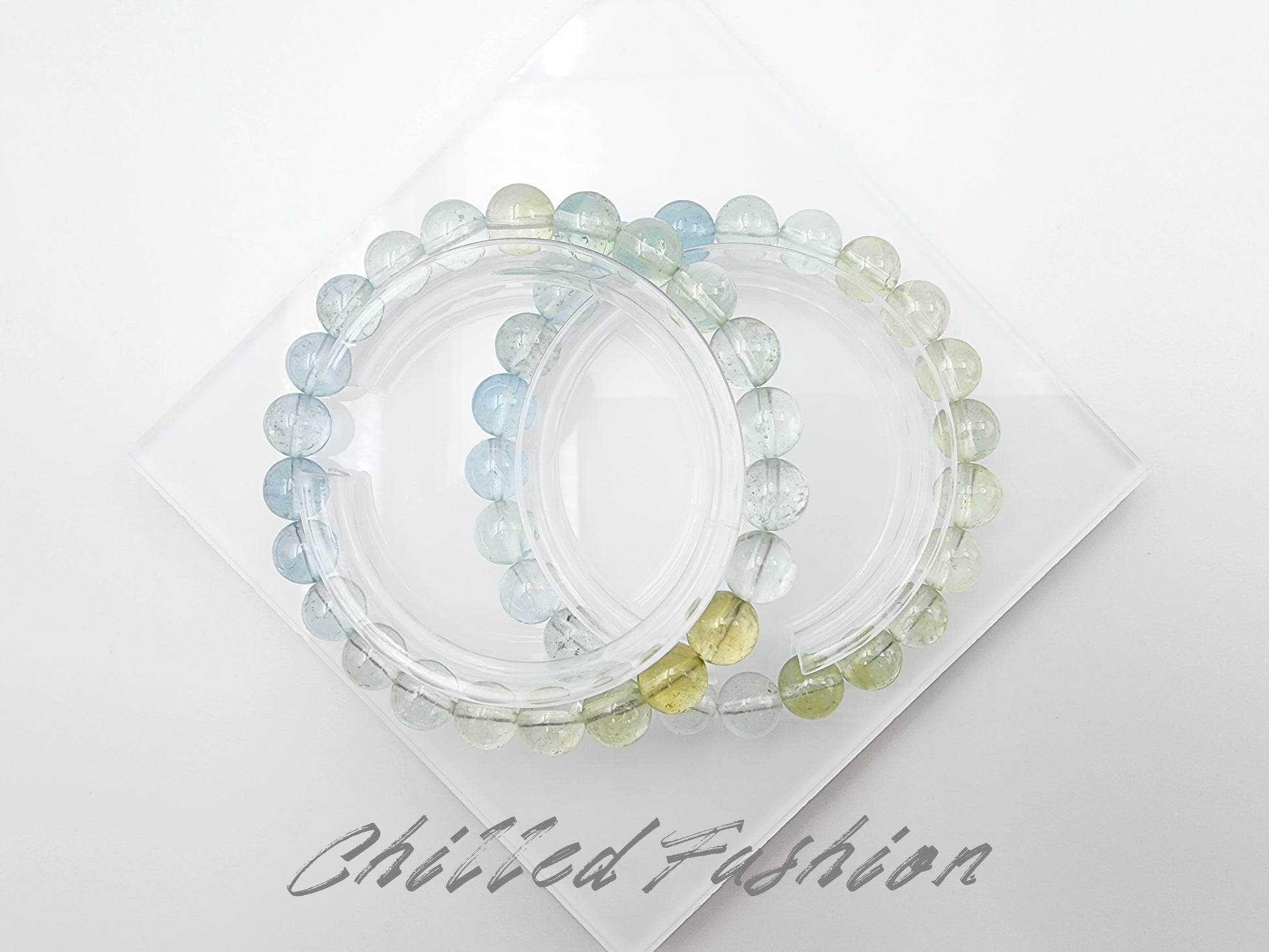 This elegant Beryl Aquamarine bracelet features natural gemstone beads in a soothing gradient of pale blue, soft green, and golden undertones—each bead revealing delicate internal textures and subtle clarity. Belonging to the beryl family, this crystal is often associated with emotional calm, gentle communication, and inner clarity, making it a favorite among those who value peaceful energy and thoughtful expression. The serene palette and smooth round beads create a look that’s both tranquil and refined. Whether worn as a daily reminder of balance or gifted as a symbol of lightness and peace, this bracelet is a beautiful way to connect with the natural energy of gemstones.