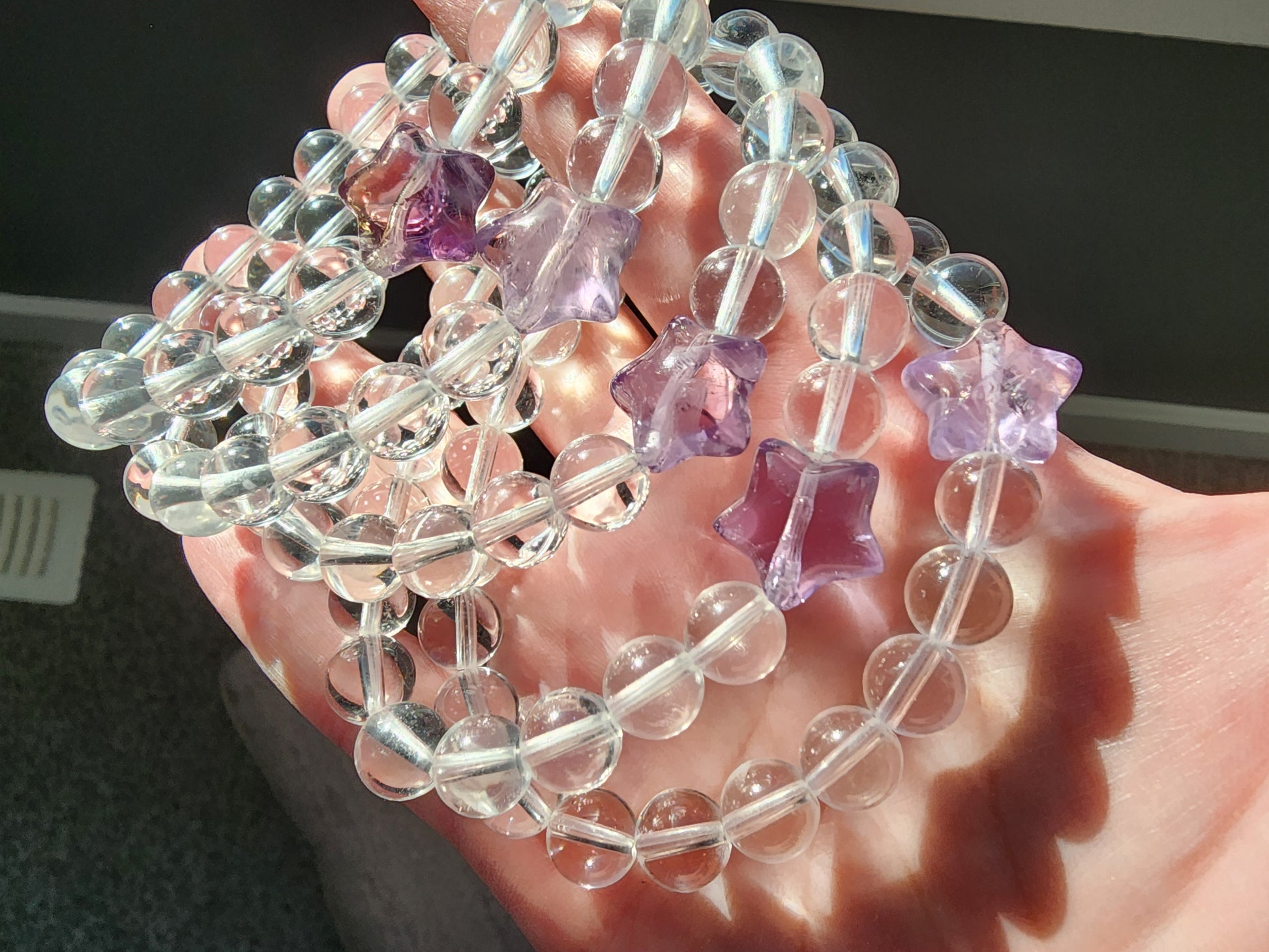 This enchanting 8mm Clear Quartz bracelet features a stunning Amethyst star-shaped bead, combining the clarity of Clear Quartz with the calming energy of Amethyst. Known as the "master healer," Clear Quartz is celebrated for amplifying positive energy and enhancing spiritual clarity, while the Amethyst star adds a touch of tranquility and balance, symbolizing peace and protection. This bracelet is perfect for those seeking to align their energies, making it a meaningful accessory for daily wear, meditation, or crystal healing practices. Its minimalist design allows it to blend seamlessly with any style, adding both elegance and spiritual charm.