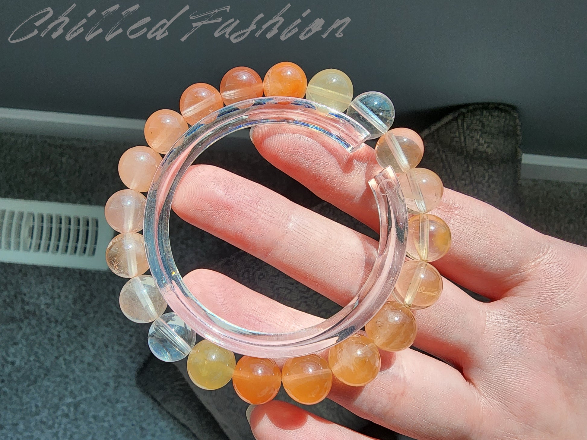 These 9mm Gradient Rabbit Hair Quartz bracelets beautifully transition through warm hues, from golden amber to delicate peach and clear tones, creating a harmonious and elegant design. While some beads feature fine, hair-like inclusions that add depth and texture, others remain perfectly clear, enhancing the overall balance and uniqueness of each bracelet. Believed to inspire positivity and inner balance, Rabbit Hair Quartz combines beauty and meaning, making it an ideal accessory for everyday wear or a thoughtful gift for someone special. Handcrafted with care, these bracelets celebrate the natural charm of gemstones.