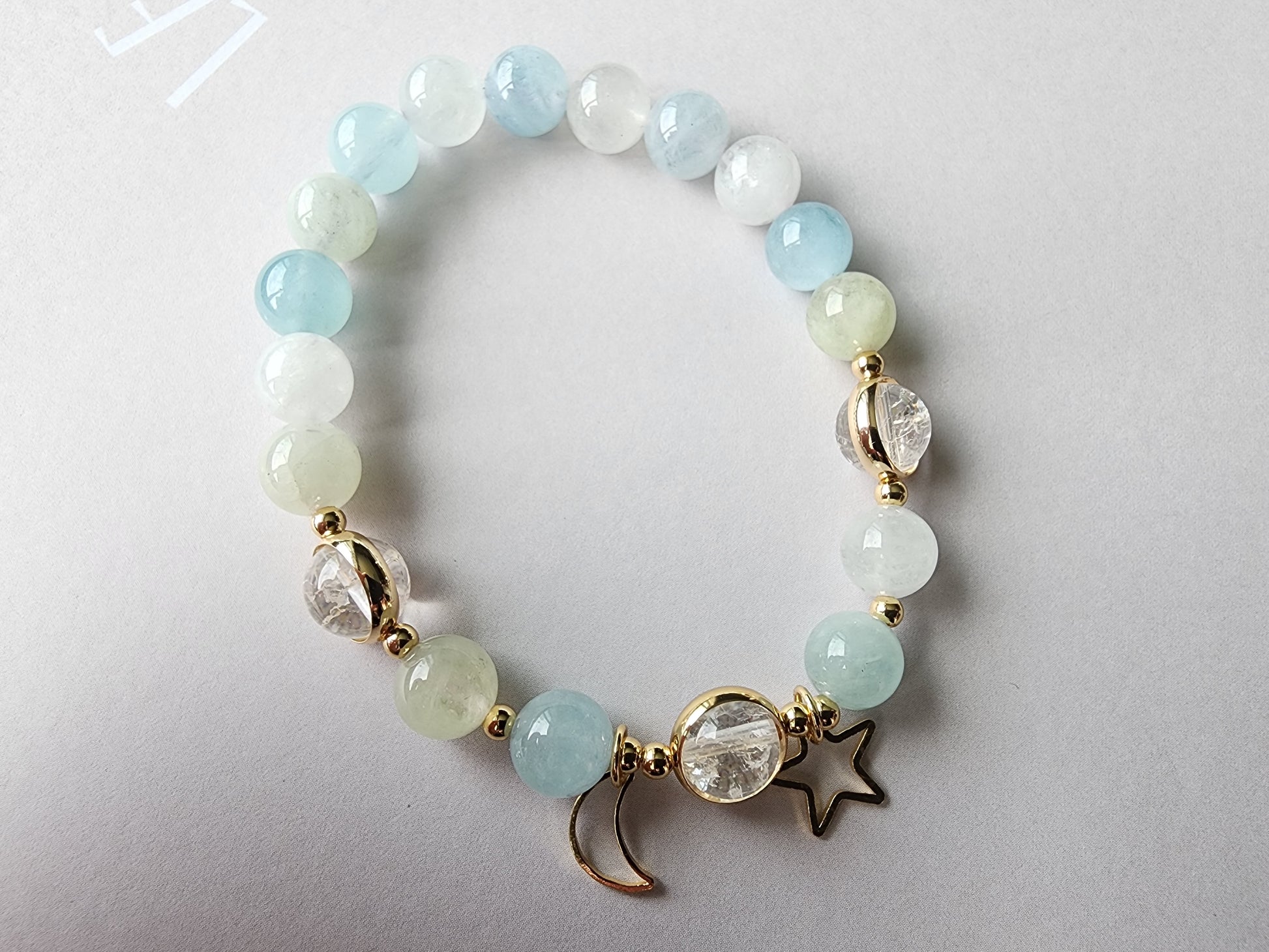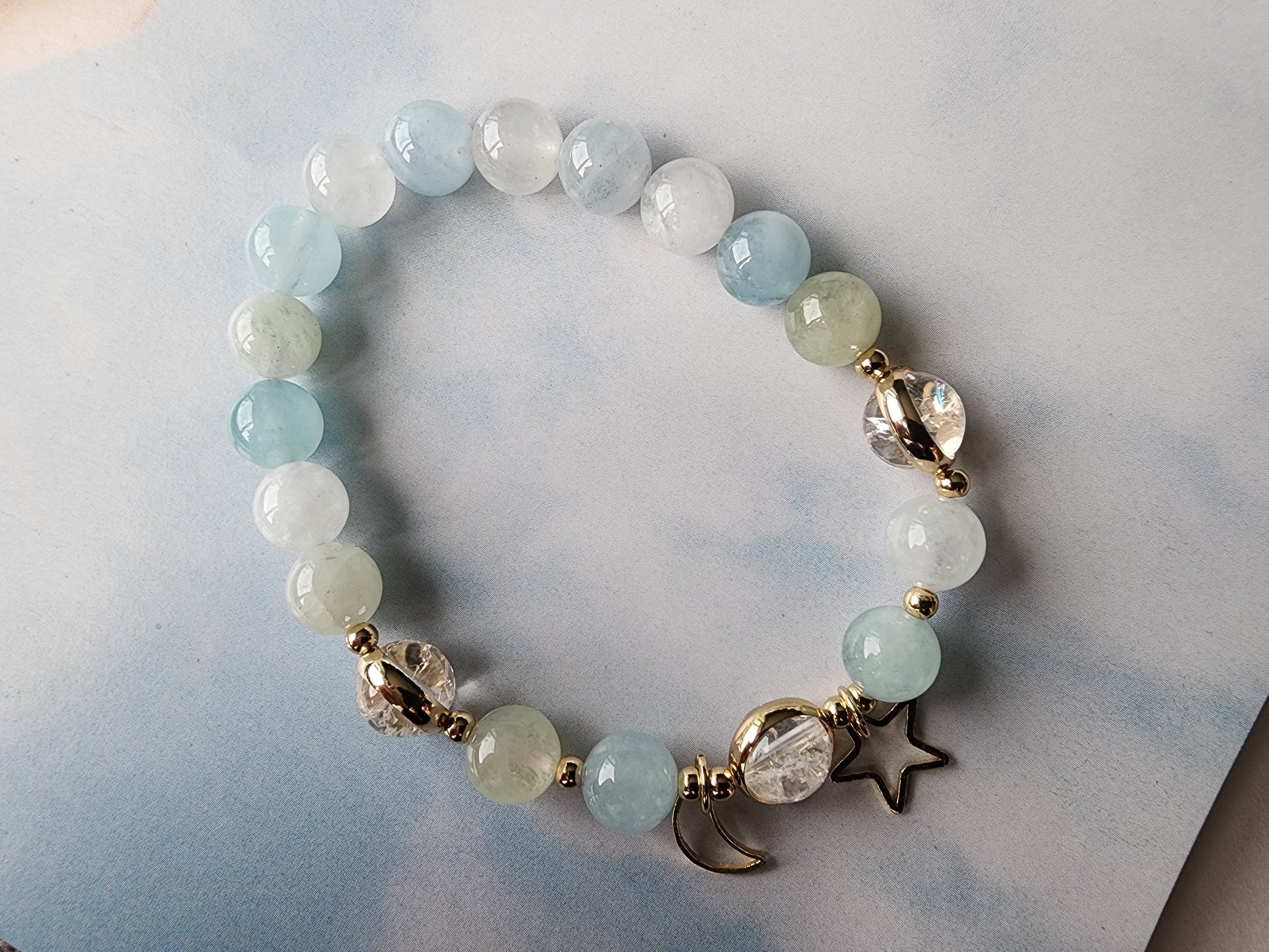 This beautiful bracelet is made of aquamarine and clear quartz beads, with the majority of the beads being aquamarine. The charm is a hollow moon and star, adding a touch of elegance to the design. The metal parts of the bracelet are gold plated brass, adding a touch of luxury to the piece. This bracelet would make a perfect addition to any jewelry collection or a thoughtful gift for someone special.