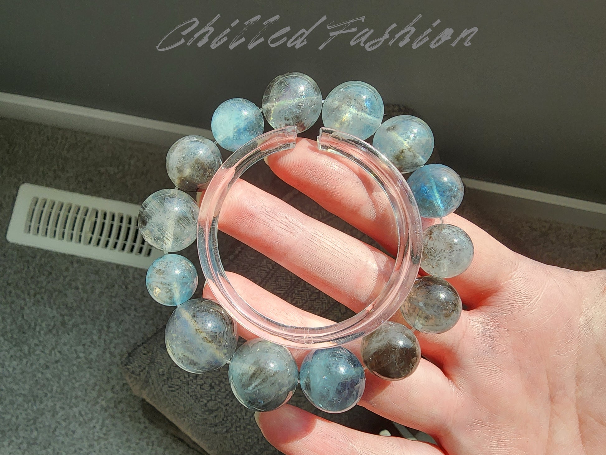 This striking Black Flash Aquamarine bracelet features large beads ranging from 17mm to 12.1mm, with each bead showcasing unique black iridescent flashes. The natural inclusions create a mesmerizing shimmer, making this bracelet a rare and eye-catching piece. Whether you're drawn to its powerful Aquamarine energy or looking for a bold accessory, this bracelet offers both elegance and an intriguing sense of mystery. Perfect for those who appreciate unique gemstones, it’s ideal for special occasions or as a standout addition to your everyday style.