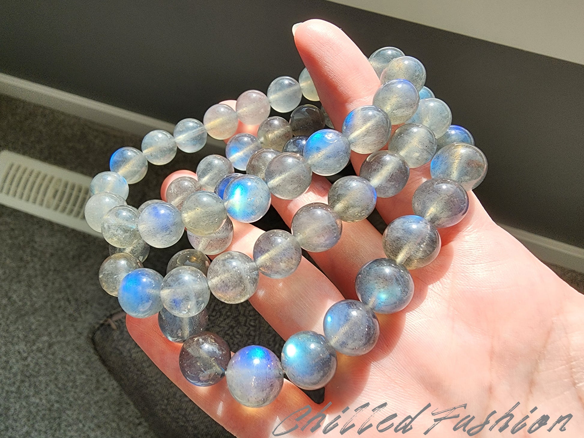 These bracelets are made with natural Blue Flash Labradorite, and each bead may display unique variations in color, flash intensity, and internal inclusions. The signature blue sheen (labradorescence) appears differently depending on the angle and lighting. Due to the natural formation of the stone, some beads may also have minor surface imperfections or texture variations—these are not flaws, but part of the authentic character and beauty of natural crystals.