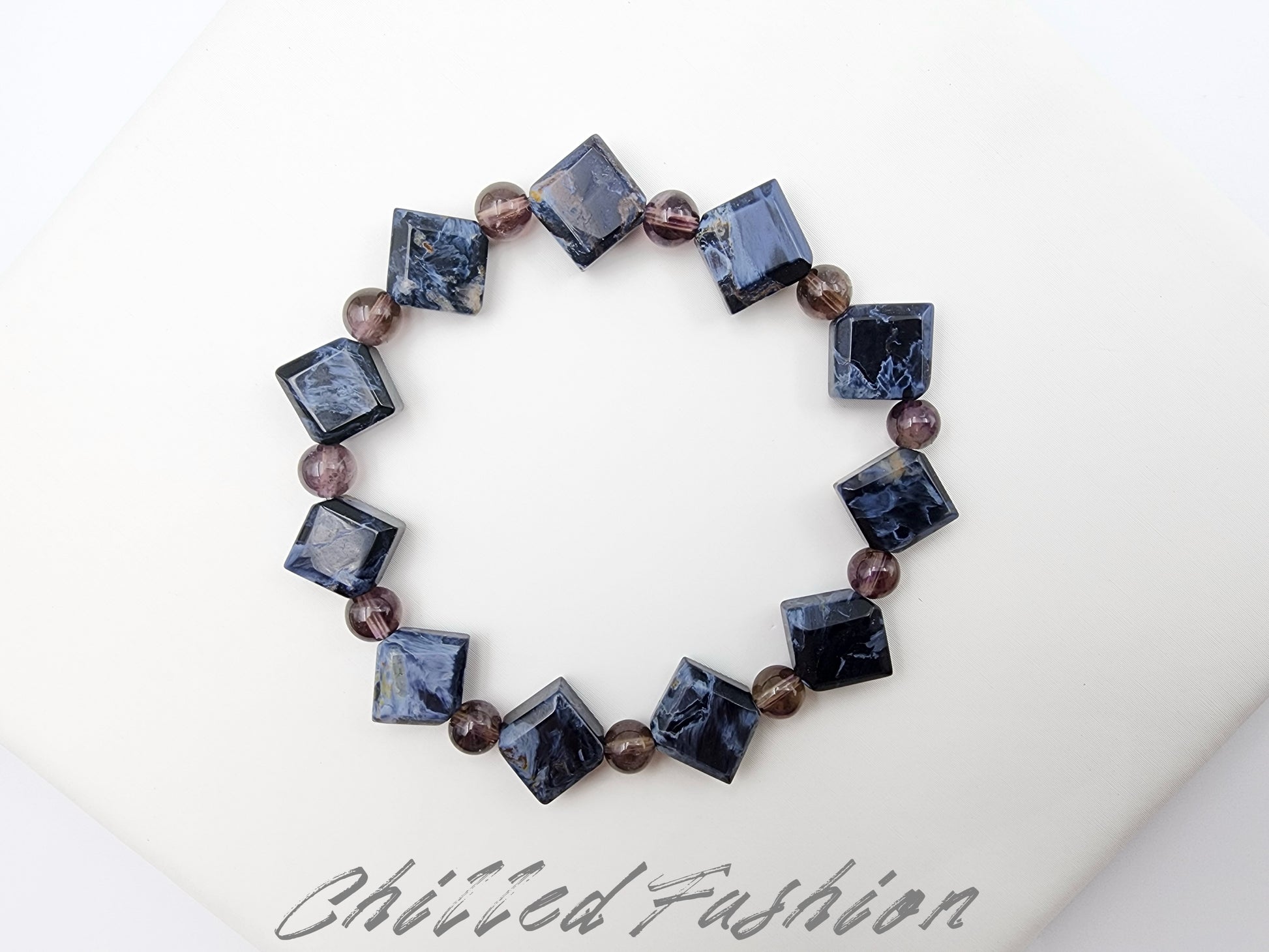 Elevate your style with these stunning Pietersite bracelets, featuring unique square-shaped beads that showcase the stone's mesmerizing stormy blue and black patterns. Often called the "Tempest Stone," Pietersite is renowned for its dynamic chatoyancy, creating a shimmering effect that mimics the movement of swirling clouds. Carefully handcrafted, these bracelets are perfect for those who appreciate natural gemstones with bold, unique textures. Pietersite is believed to inspire clarity, strength, and grounding energy, making this piece not just a beautiful accessory but also a meaningful one. Ideal for both casual and formal looks, these bracelets are a timeless addition to any jewelry collection.