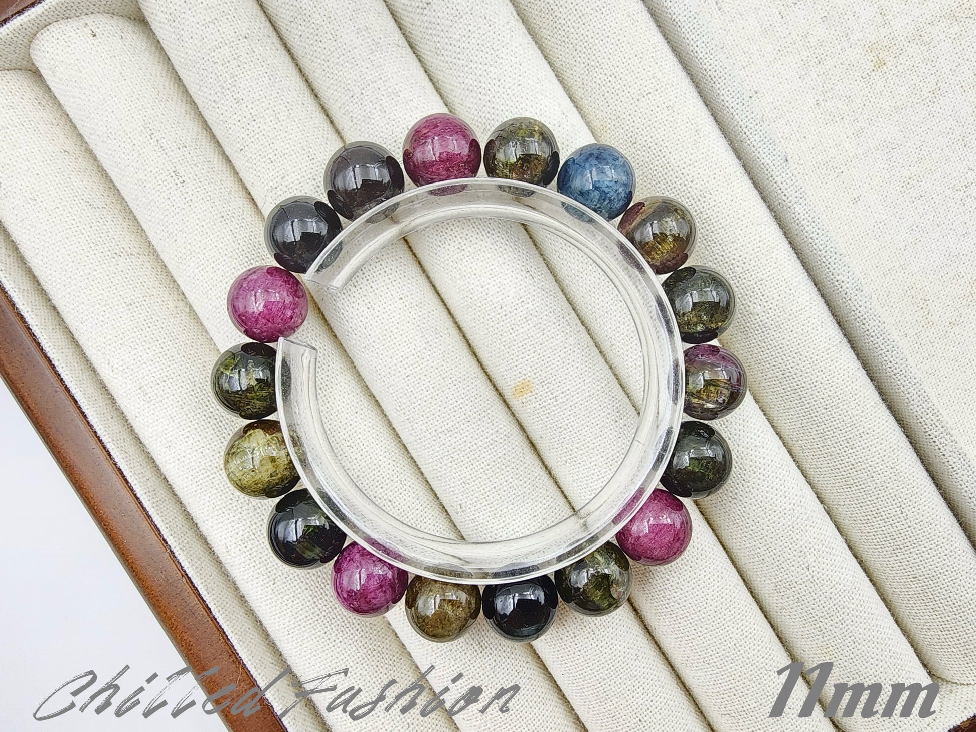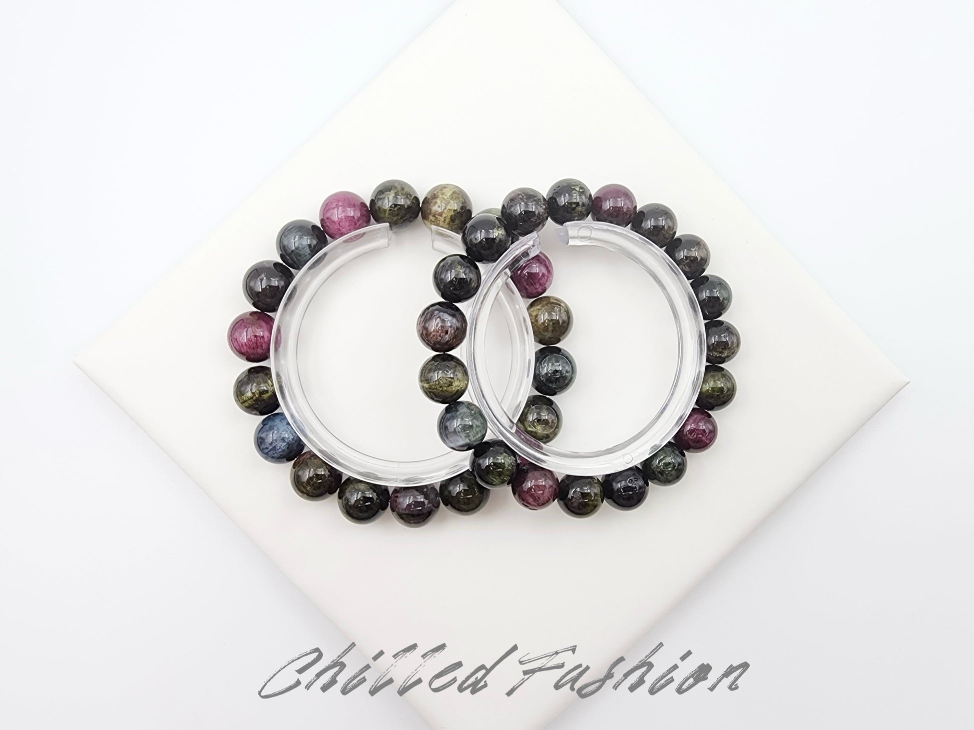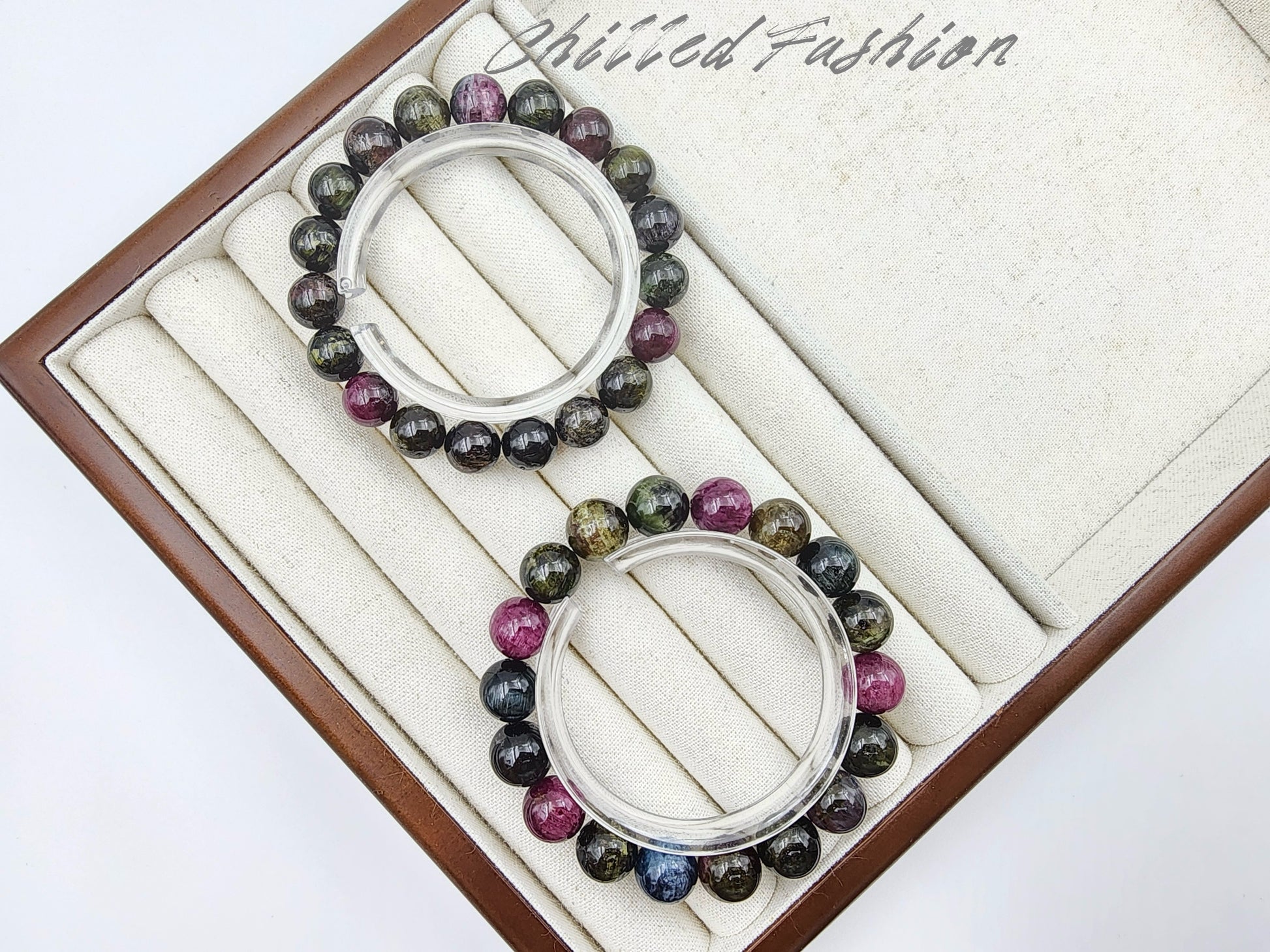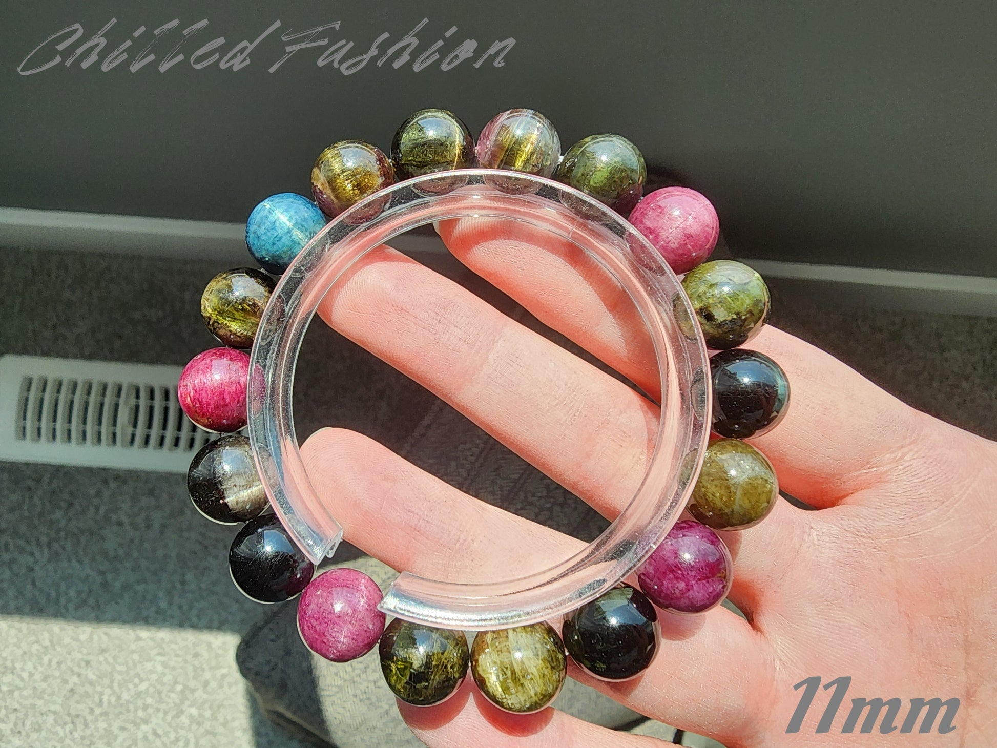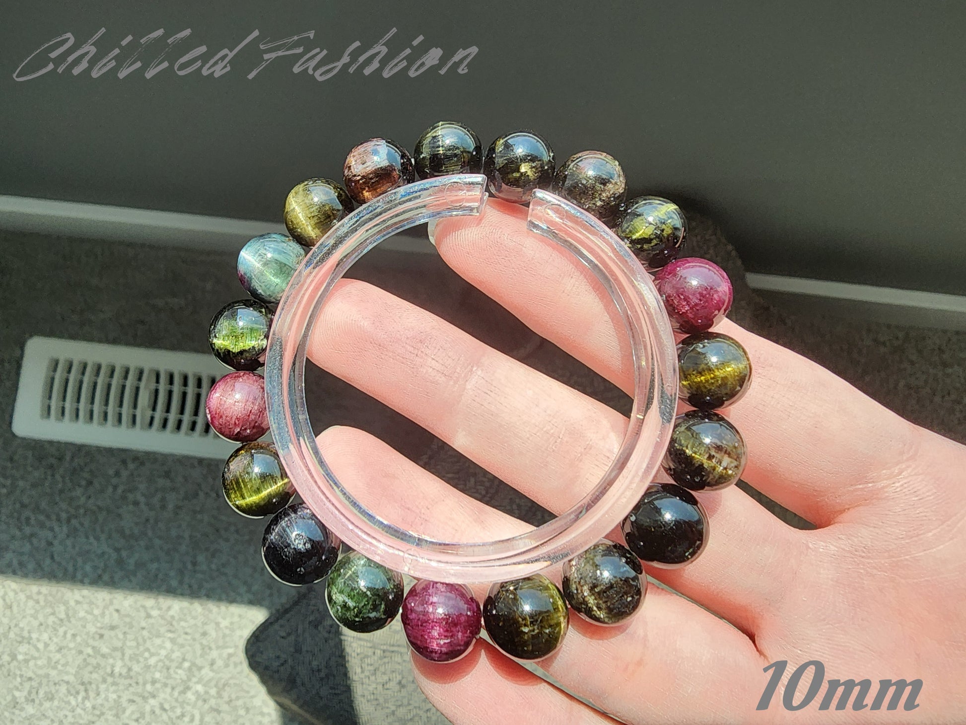 This vibrant Colorful Tourmaline bracelet features an array of natural hues—deep greens, rich pinks, earthy browns, and oceanic blues—each bead showcasing a luminous cat’s eye effect known as chatoyancy. Tourmaline has long been admired for its symbolic connection to emotional balance and personal strength, with each color traditionally associated with different energies: pink for compassion, green for vitality, blue for clarity, and black for grounding. The chatoyant shimmer adds a touch of mystery and movement, making this bracelet not just a beautiful accessory, but also a meaningful symbol of harmony and protection.