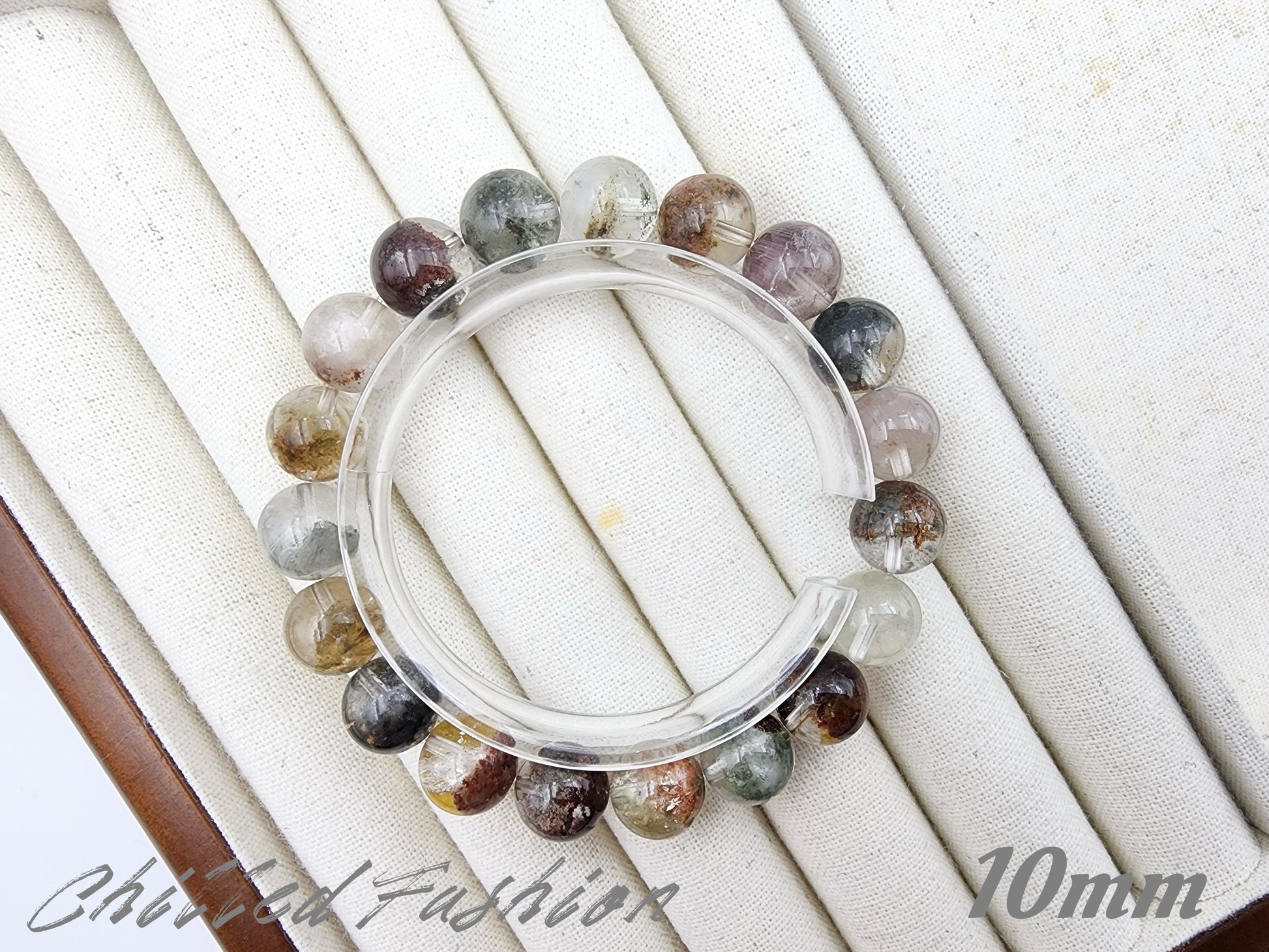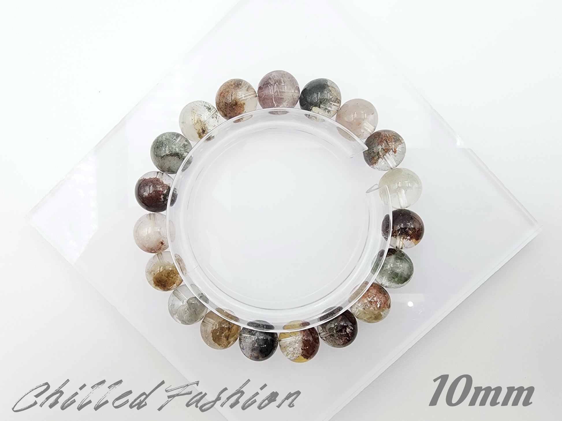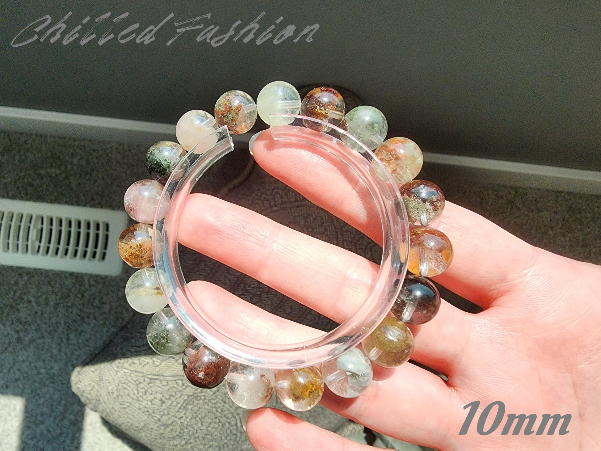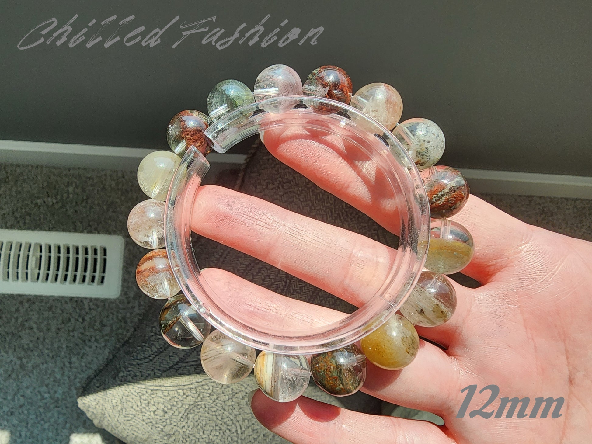 Each of these Colorful Phantom Quartz bracelets features vibrant natural inclusions that resemble miniature gardens or swirling landscapes captured within crystal spheres. What makes them especially unique is the half-bowl style of the phantoms inside—like tiny treasure basins forming at the base of each bead. With rich hues of green, red, purple, and smoky tones, these multicolored inclusions bring a lively, organic charm to every bracelet. Believed to enhance clarity, attract abundance, and ground energy, this type of quartz is cherished by collectors and energy lovers alike. A captivating piece that blends natural artistry with spiritual symbolism—perfect for daily wear or gifting.