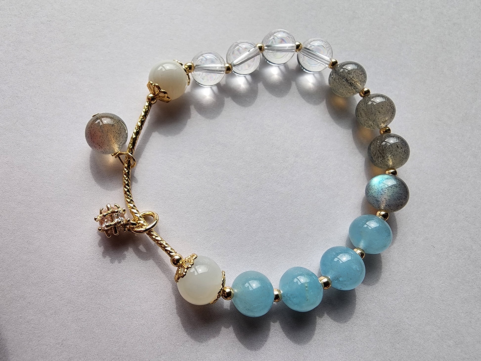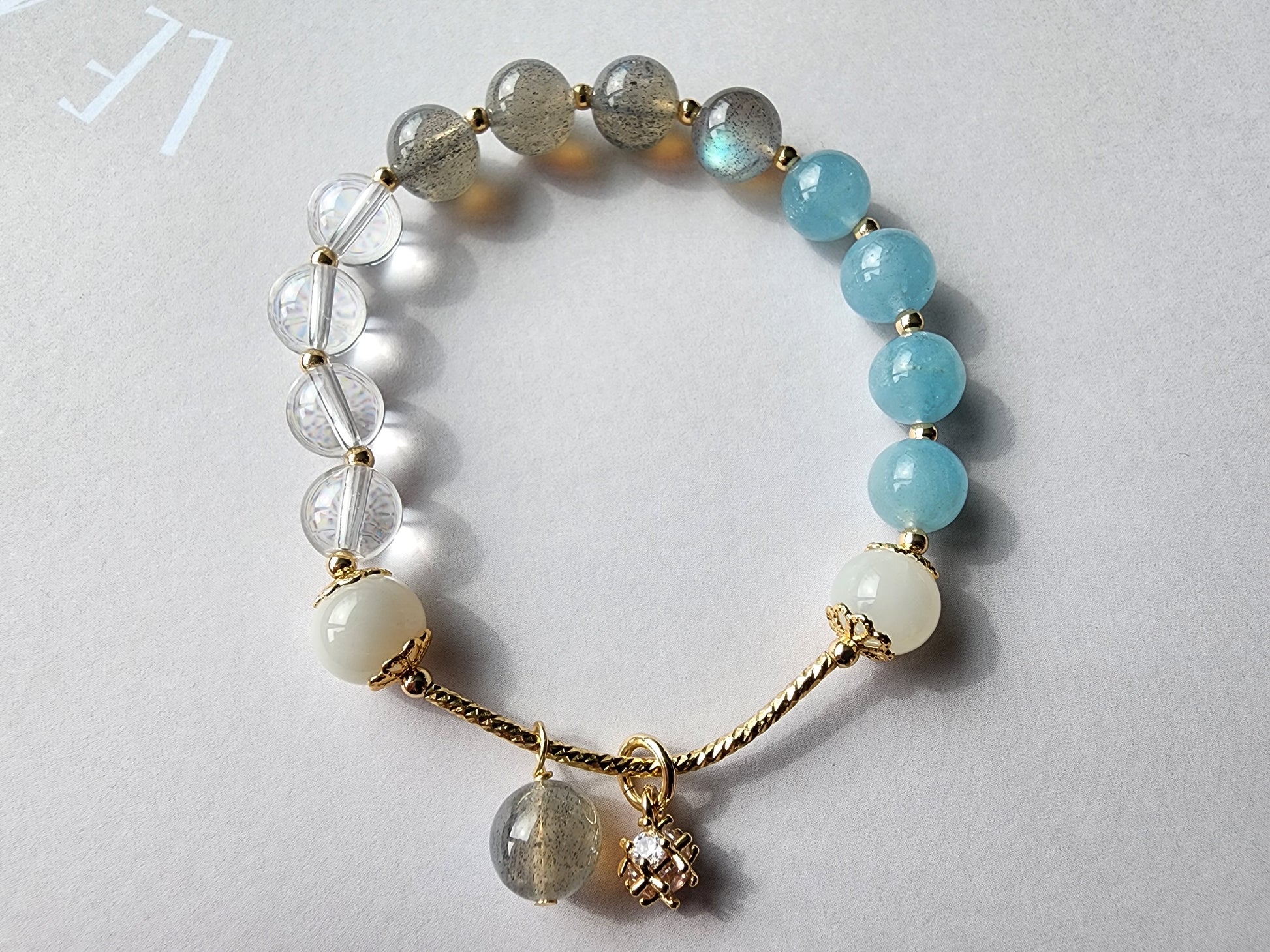 [Bracelet] Elegant Aquamarine, Clear Quartz, and Grey Moonstone Beaded Bracelet with Gold-Plated Brass Accents