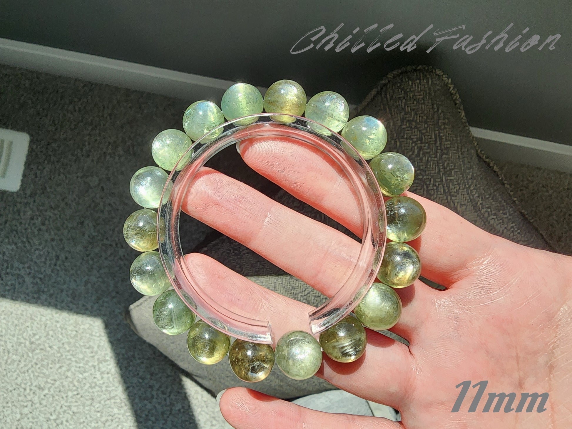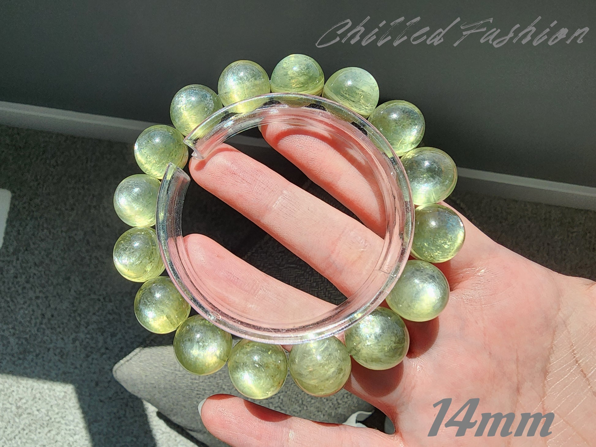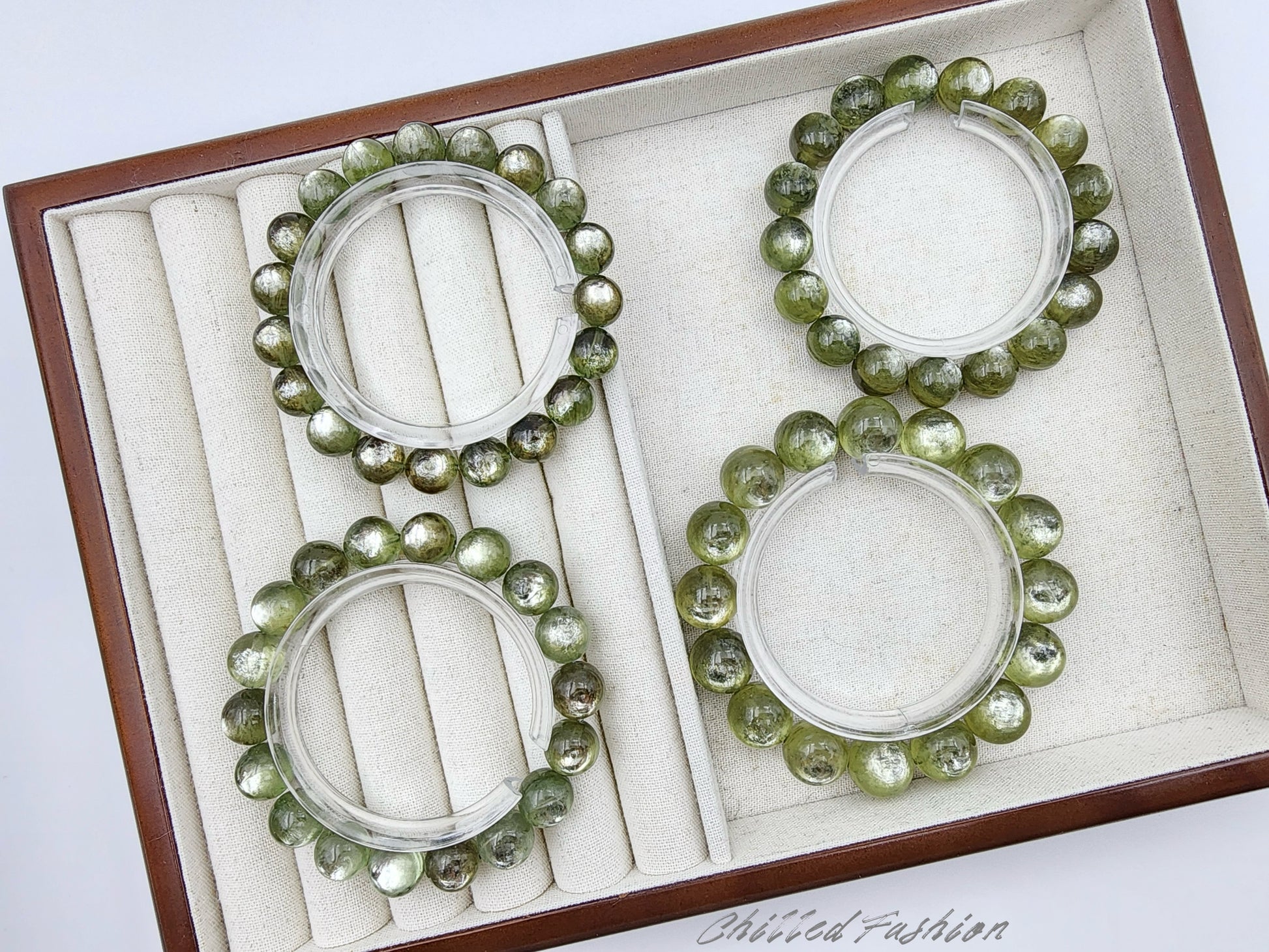 Embrace the beauty of nature's handiwork! Green lithium mica bracelets feature unique variations in each bead's color and surface, reflecting the mineral's natural formation. Due to the stone's delicate nature, the beads may not be perfectly round and are prone to breakage from strong impacts. This adds to the charm of your bracelet, making it a one-of-a-kind piece!