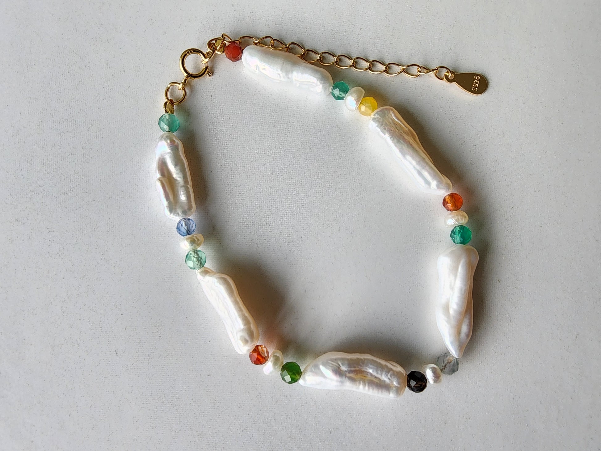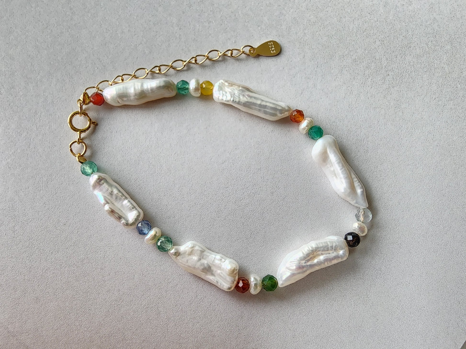 [Bracelet] Enchanting Sterling Silver 925 Bracelet with Lustrous Baroque Pearls and Vibrant Agate Beads