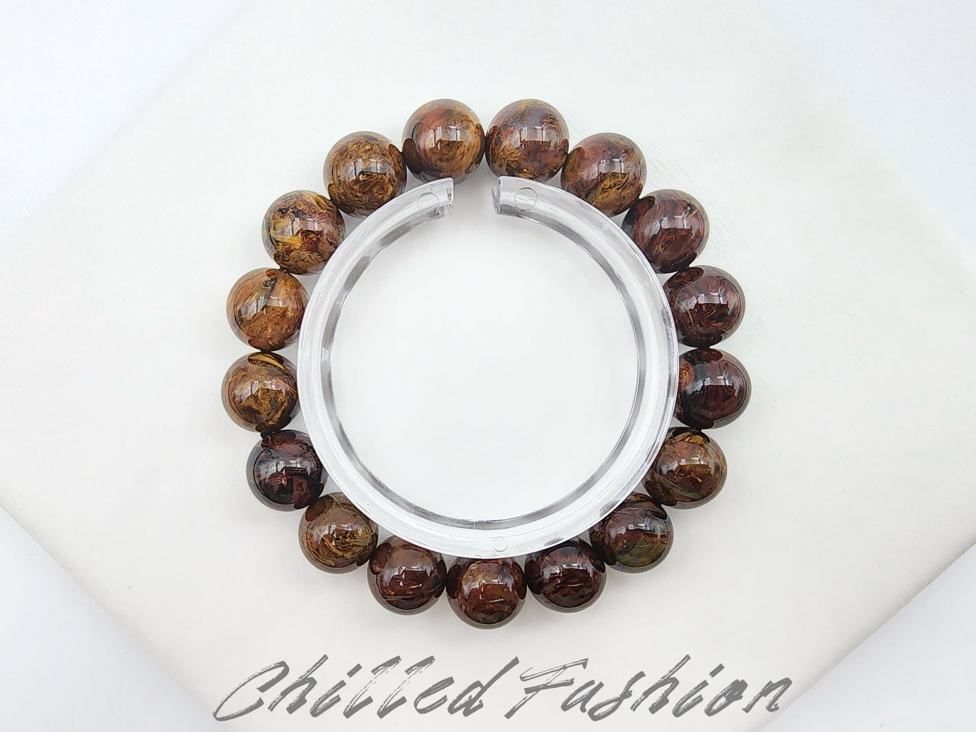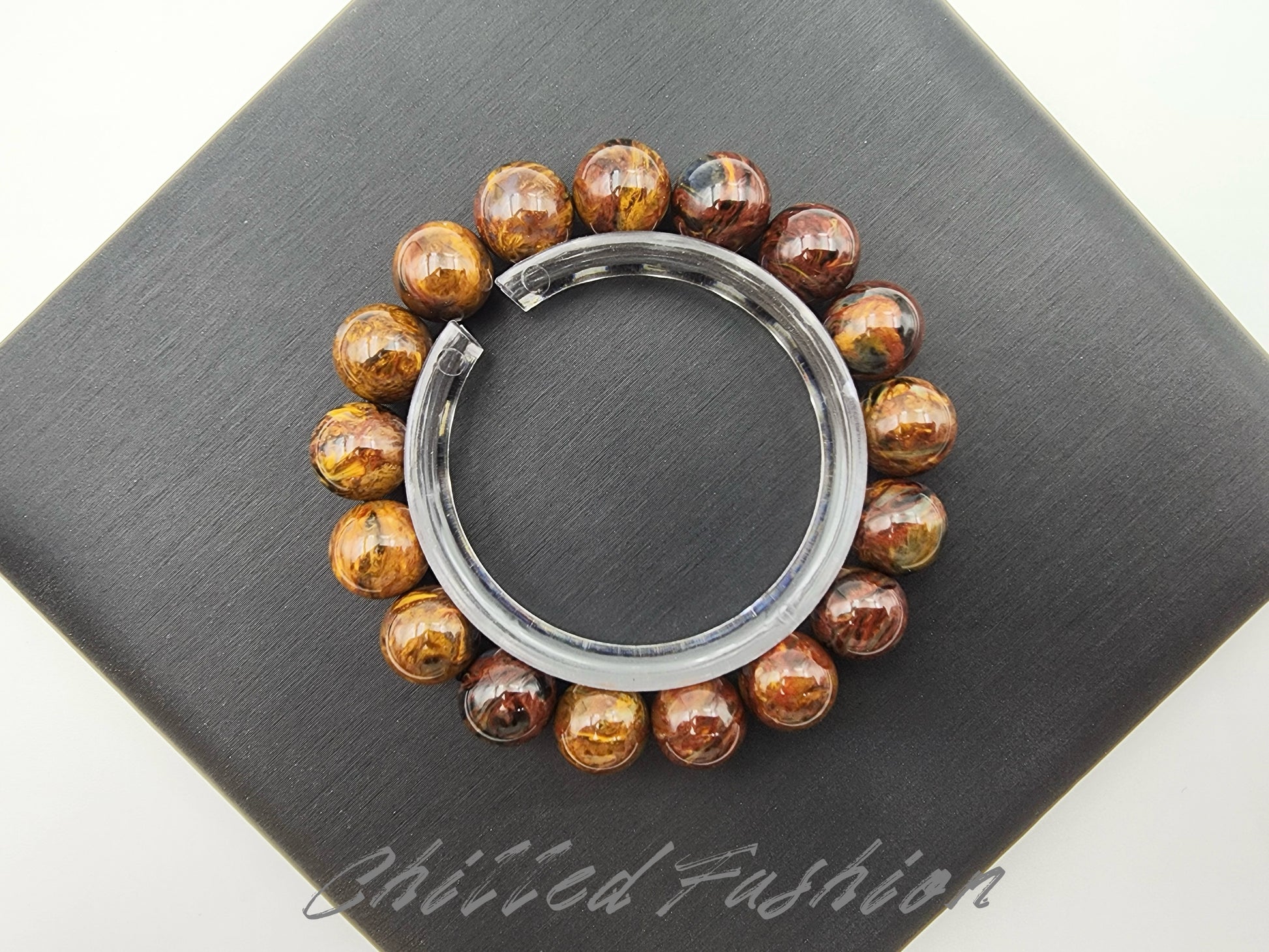 Embrace the captivating beauty and dynamic energy of our Phoenix Style Pietersite Bracelet. Each bead in this stunning bracelet showcases the swirling, fiery patterns characteristic of Pietersite, often referred to as the 'Tempest Stone' for its storm-like appearance. The rich, earthy tones and intricate designs evoke the mythical Phoenix, symbolizing renewal, transformation, and inner strength. Known for its powerful metaphysical properties, Pietersite is believed to enhance spiritual vision, meditation, and personal insight. This handcrafted bracelet is not only a striking accessory but also a meaningful piece for those seeking to harness the transformative energy of the Phoenix. Perfect for everyday wear or special occasions, our Phoenix Style Pietersite Bracelet is a unique addition to any jewelry collection.