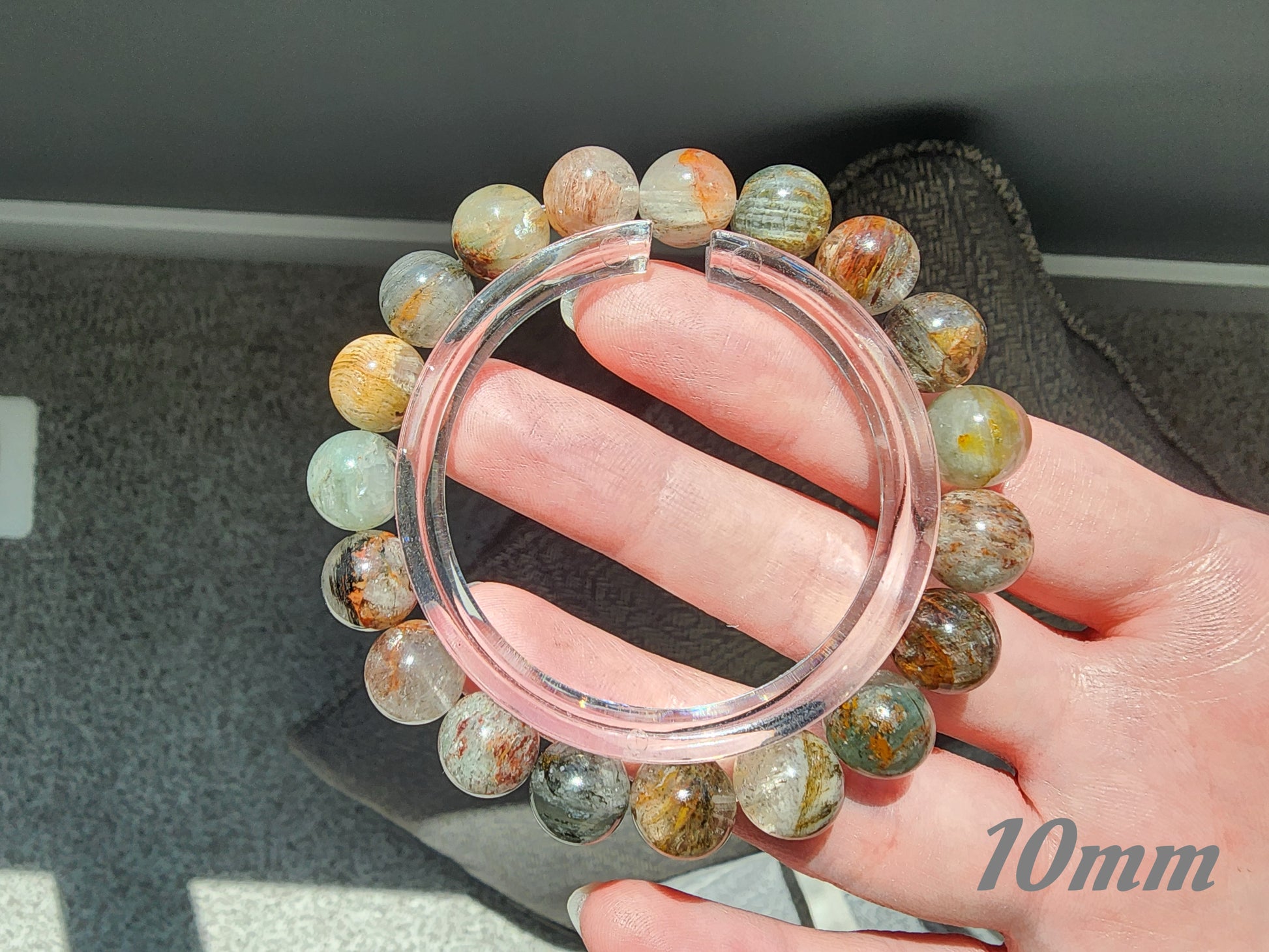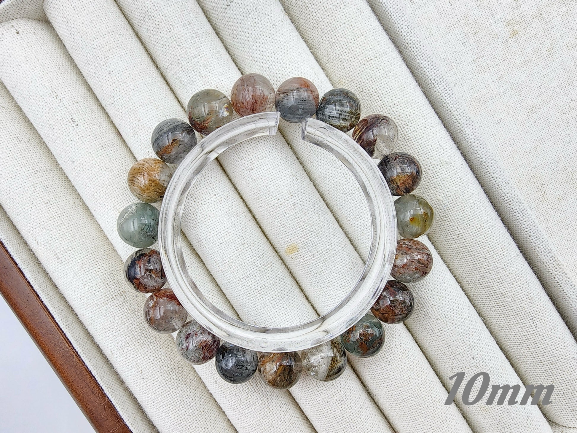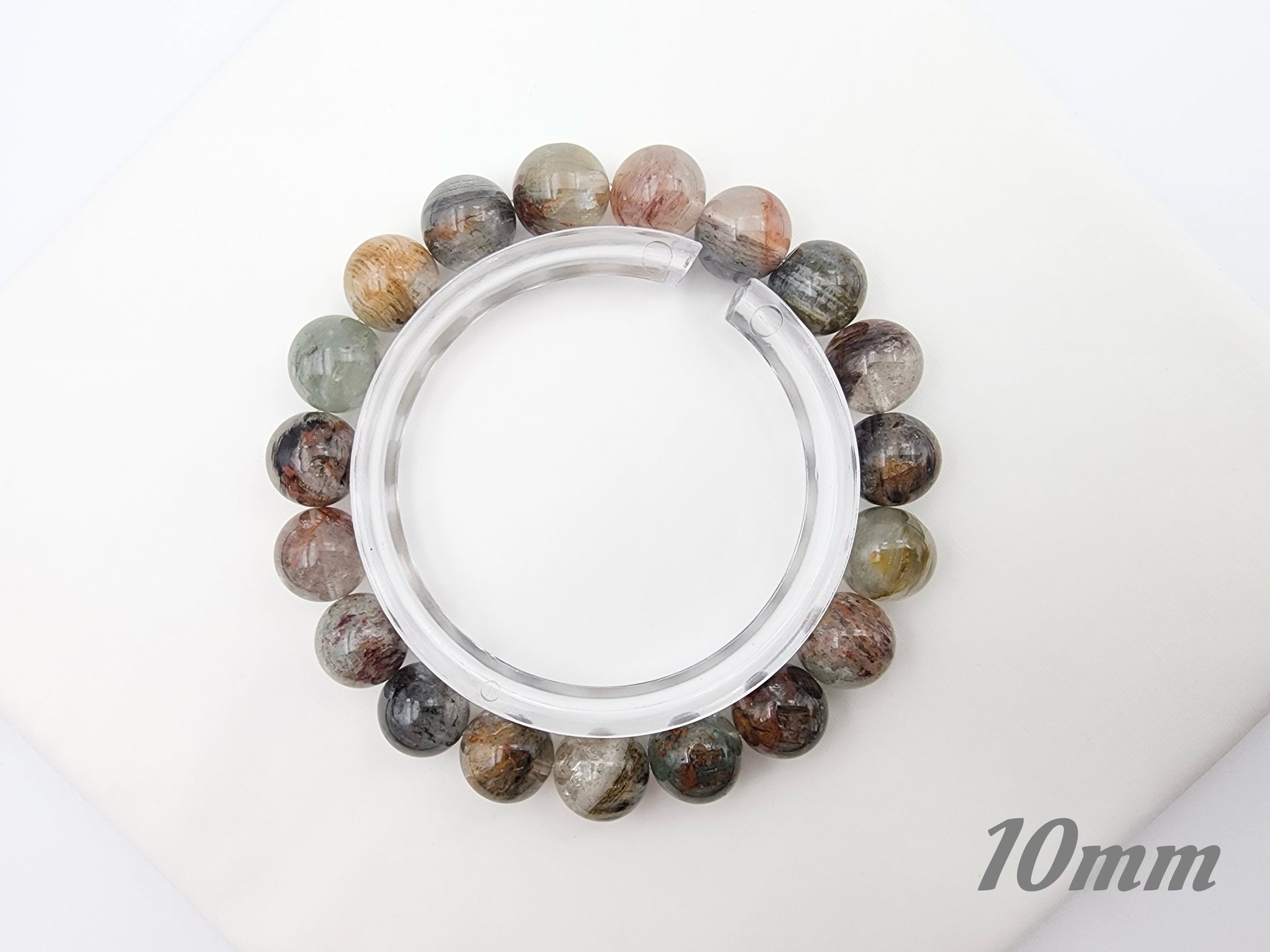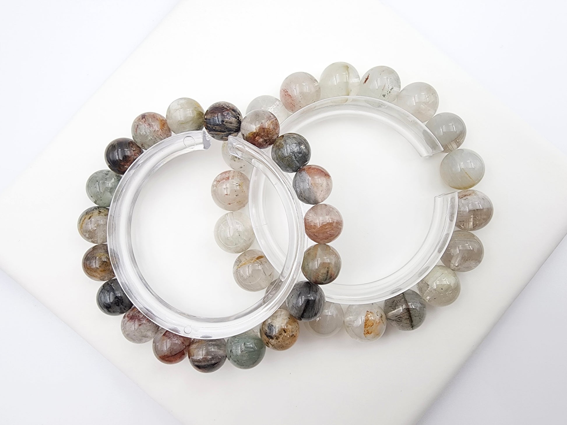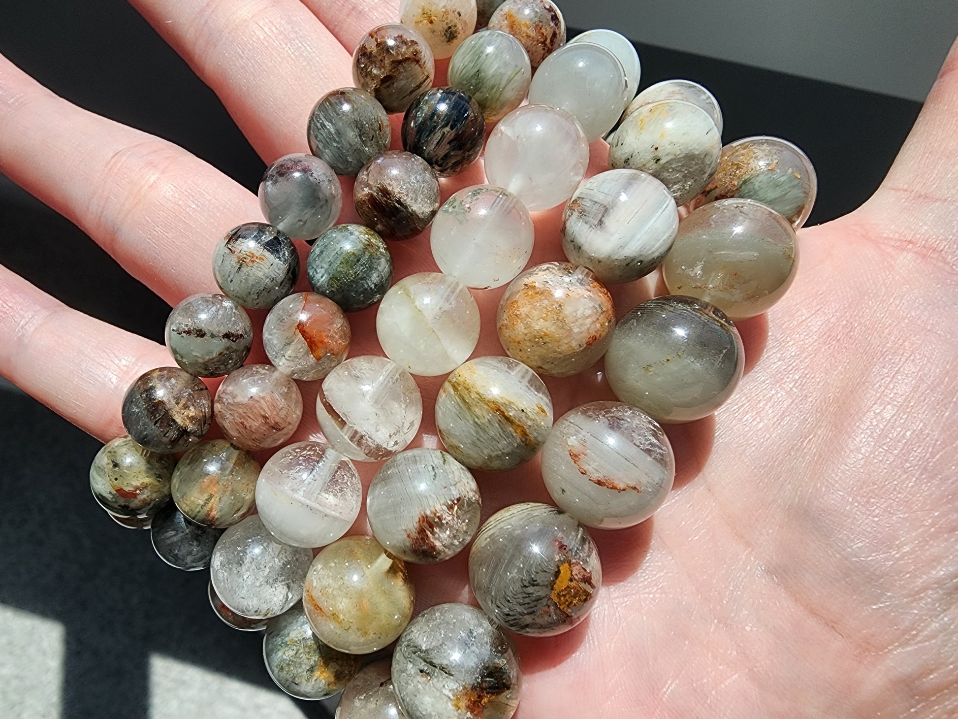 These Phantom Quartz with Rutile Inclusions bracelets feature a stunning interplay of natural elements—wispy, hair-like rutile threads weaving through translucent quartz, alongside ethereal phantom formations that appear like layered shadows frozen in time. Each bead is a one-of-a-kind miniature landscape, showcasing earthy tones ranging from smoky greys to mossy greens and deep rust reds. The fusion of phantom structures and rutile inclusions gives these bracelets a richly textured and multidimensional appearance, making them perfect for those who appreciate natural beauty with character and depth. Often associated with focus and grounding, Phantom Quartz is believed to aid in personal growth and clarity, while Rutile inclusions are thought to enhance energy flow and support mental sharpness—making this bracelet not only a beautiful accessory but a meaningful companion for daily life.