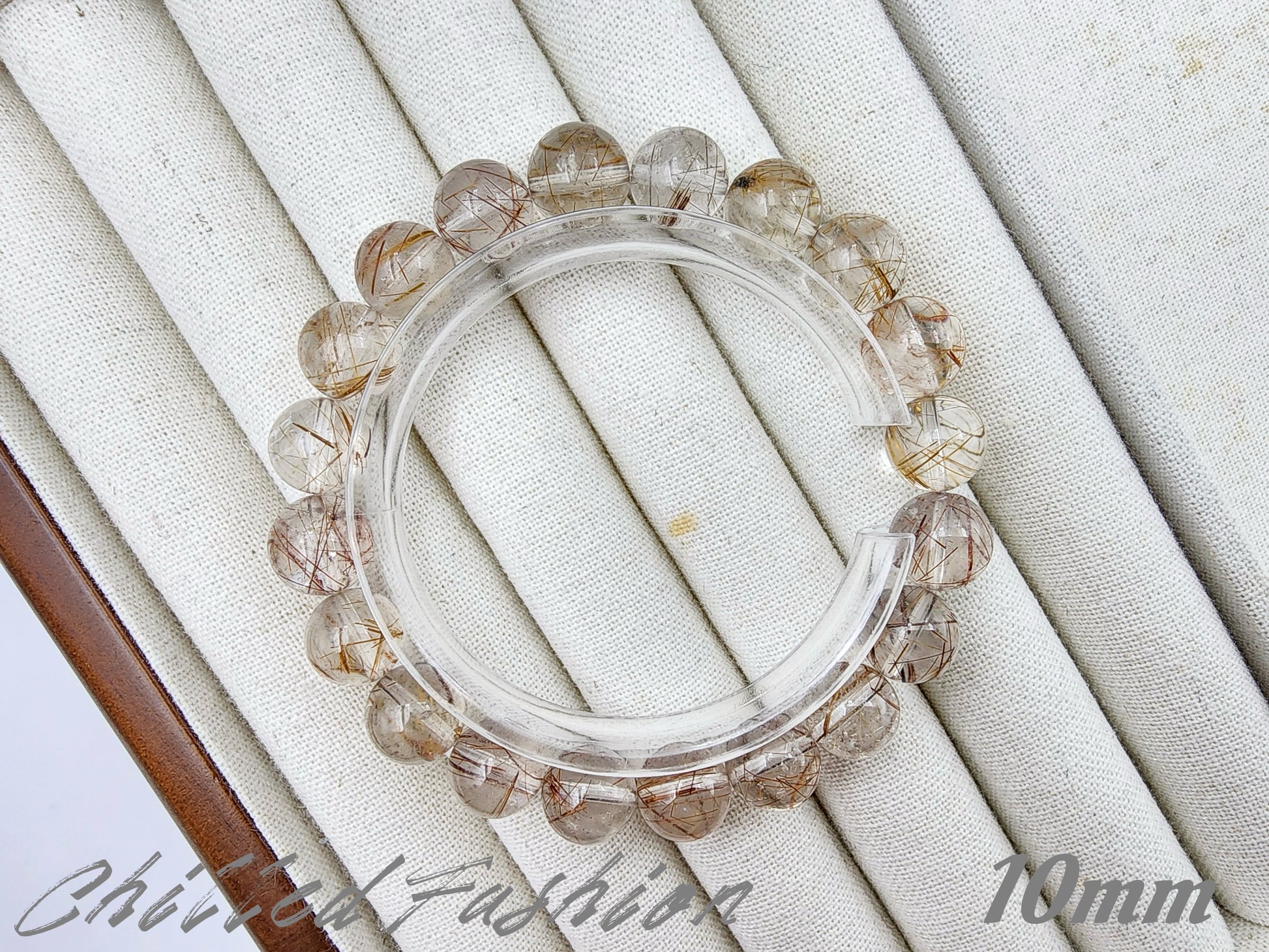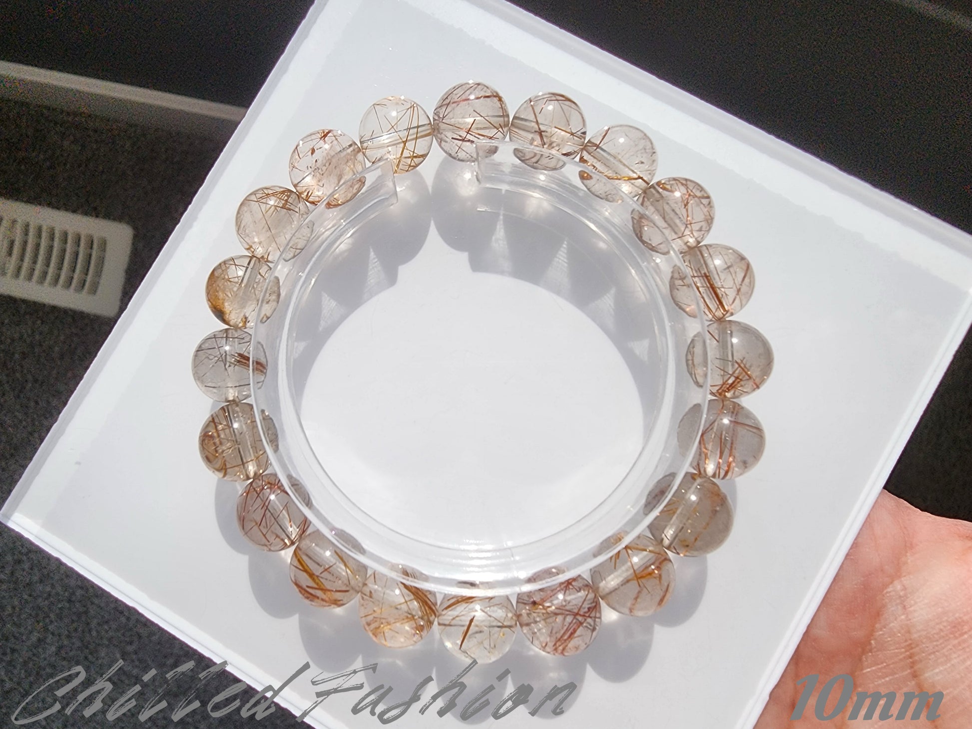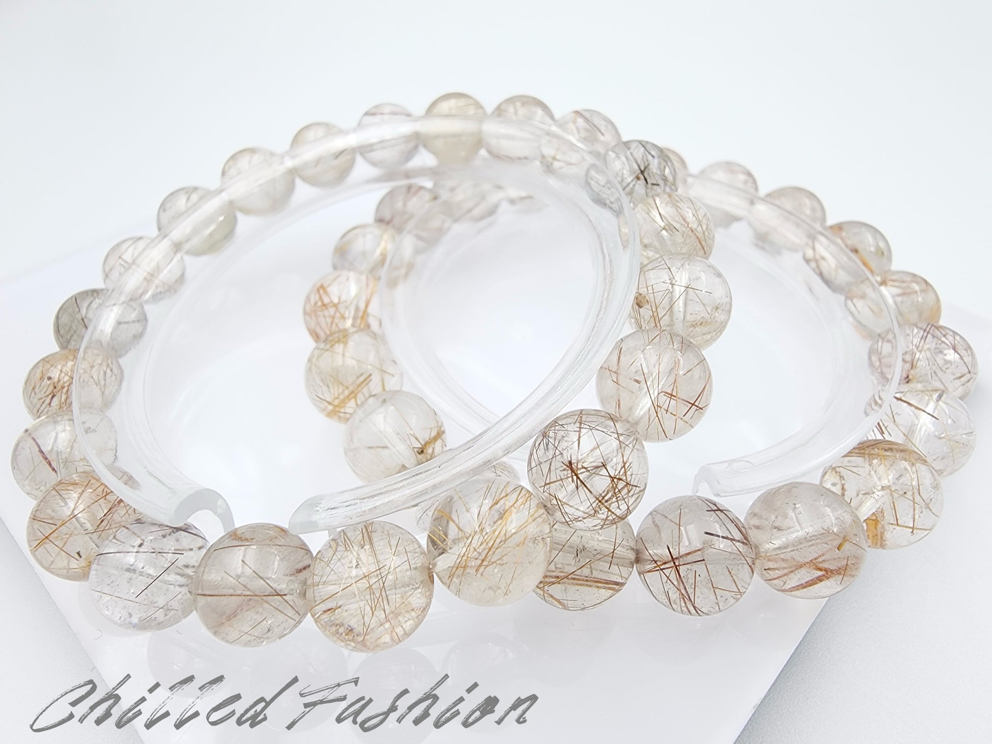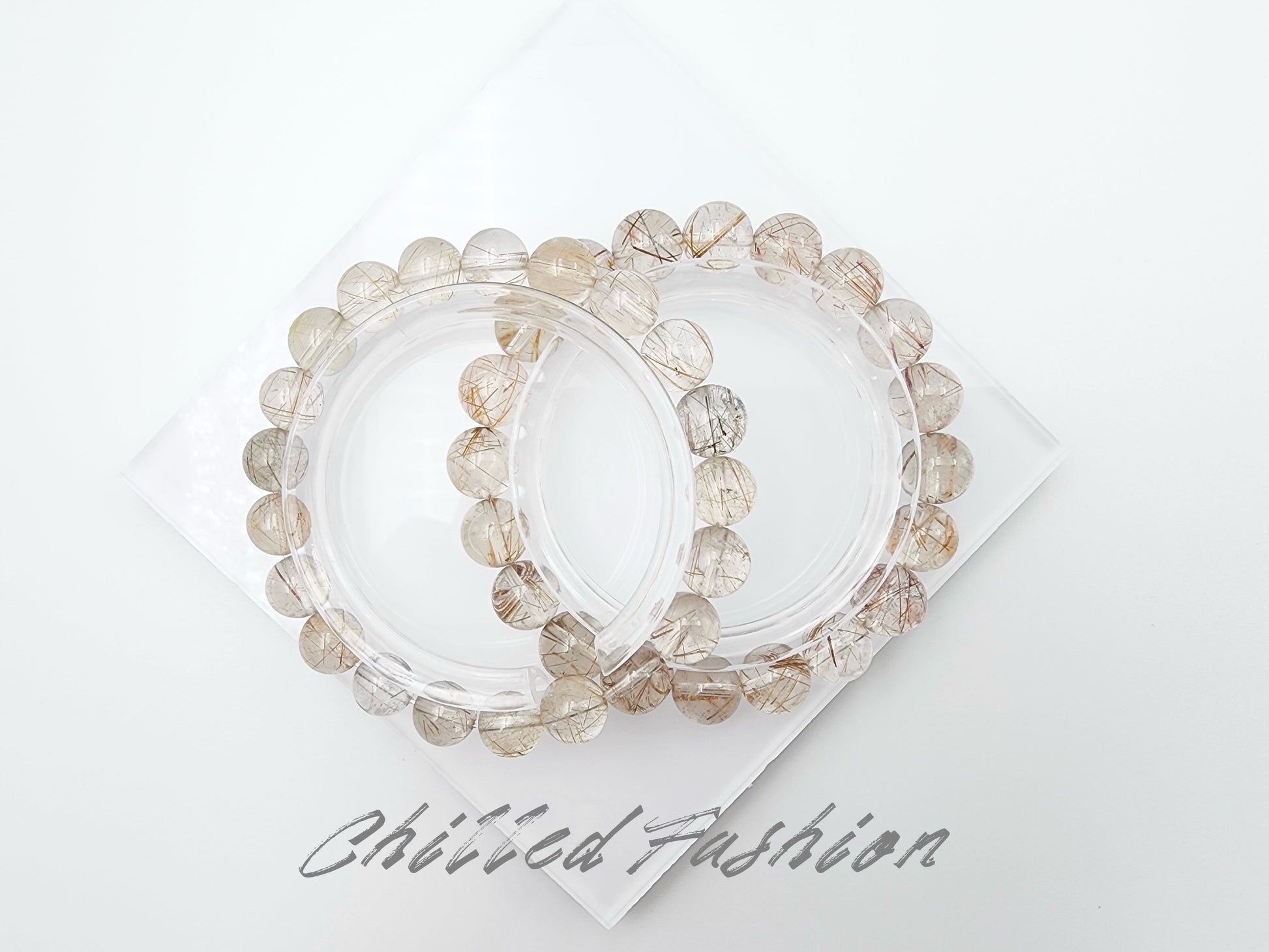 Experience the captivating allure and powerful energy of these exquisite Rutilated Quartz bracelets, crafted with hand-selected beads showcasing a stunning combination of golden and red rutile inclusions. The unique, hair-like threads within each bead create a visually striking pattern, making each bracelet a one-of-a-kind piece. Rutilated Quartz, often referred to as the 'Hair Crystal,' is cherished for its ability to enhance intuition, clarity, and spiritual growth. This bracelet not only adds a touch of elegance to any outfit but also serves as a meaningful accessory, believed to promote positive energy and protection. Whether as a thoughtful gift or a personal keepsake, these Rutilated Quartz bracelets are sure to inspire and enchant.