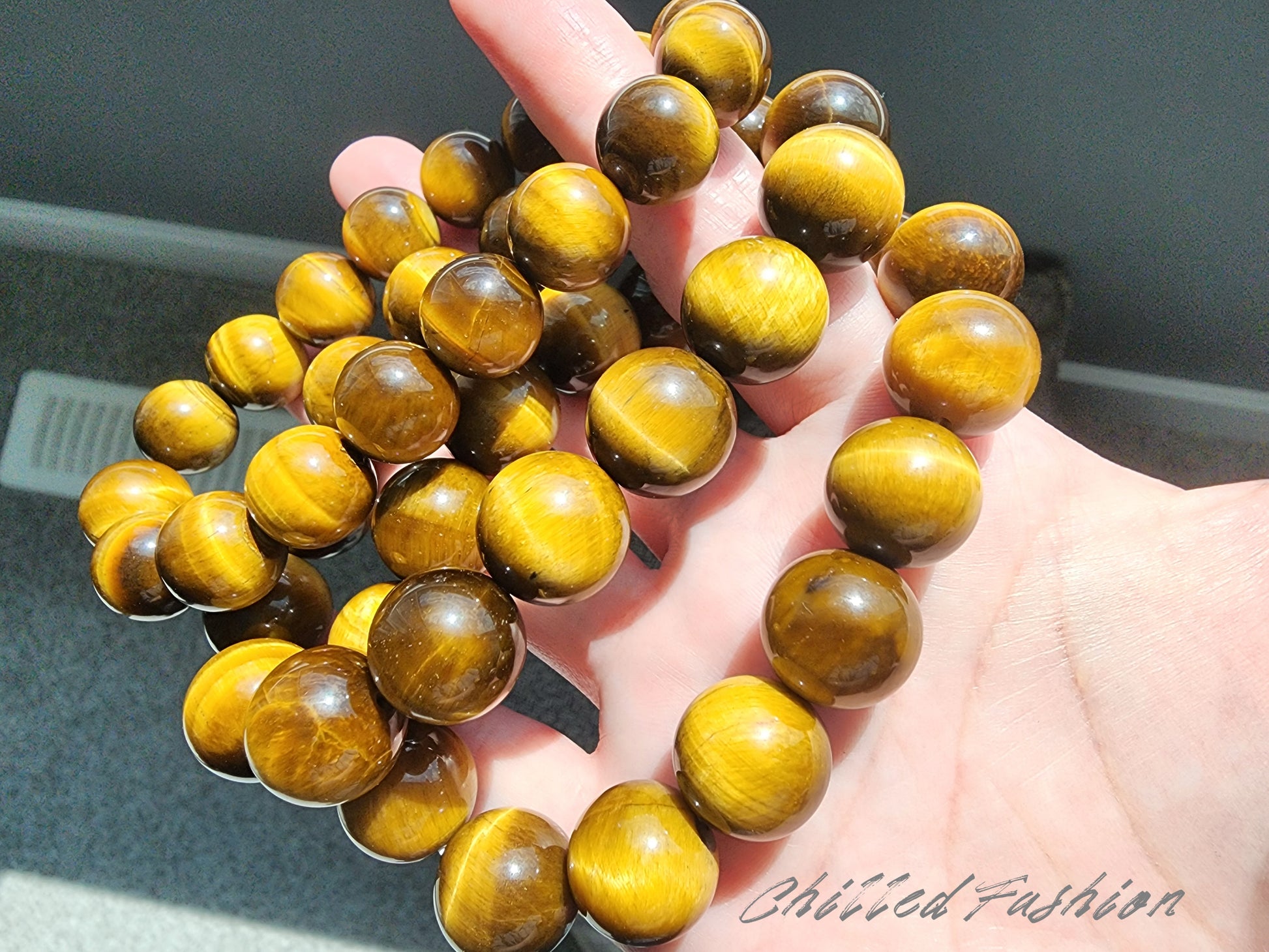 These Yellow Tiger's Eye bracelets showcase the captivating golden-brown chatoyancy that makes Tiger's Eye so popular. Known for promoting confidence, focus, and grounding energy, each bead radiates a warm, natural glow that captures the beauty of the stone. Perfect for both men and women, this bracelet adds a touch of elegance and power to any outfit while symbolizing protection and inner strength. Whether you're looking for a stylish accessory or a meaningful crystal to support your personal journey, this Yellow Tiger's Eye bracelet is a versatile and timeless choice. Each bracelet is crafted to highlight the unique patterns and vibrant color of these natural gemstones.