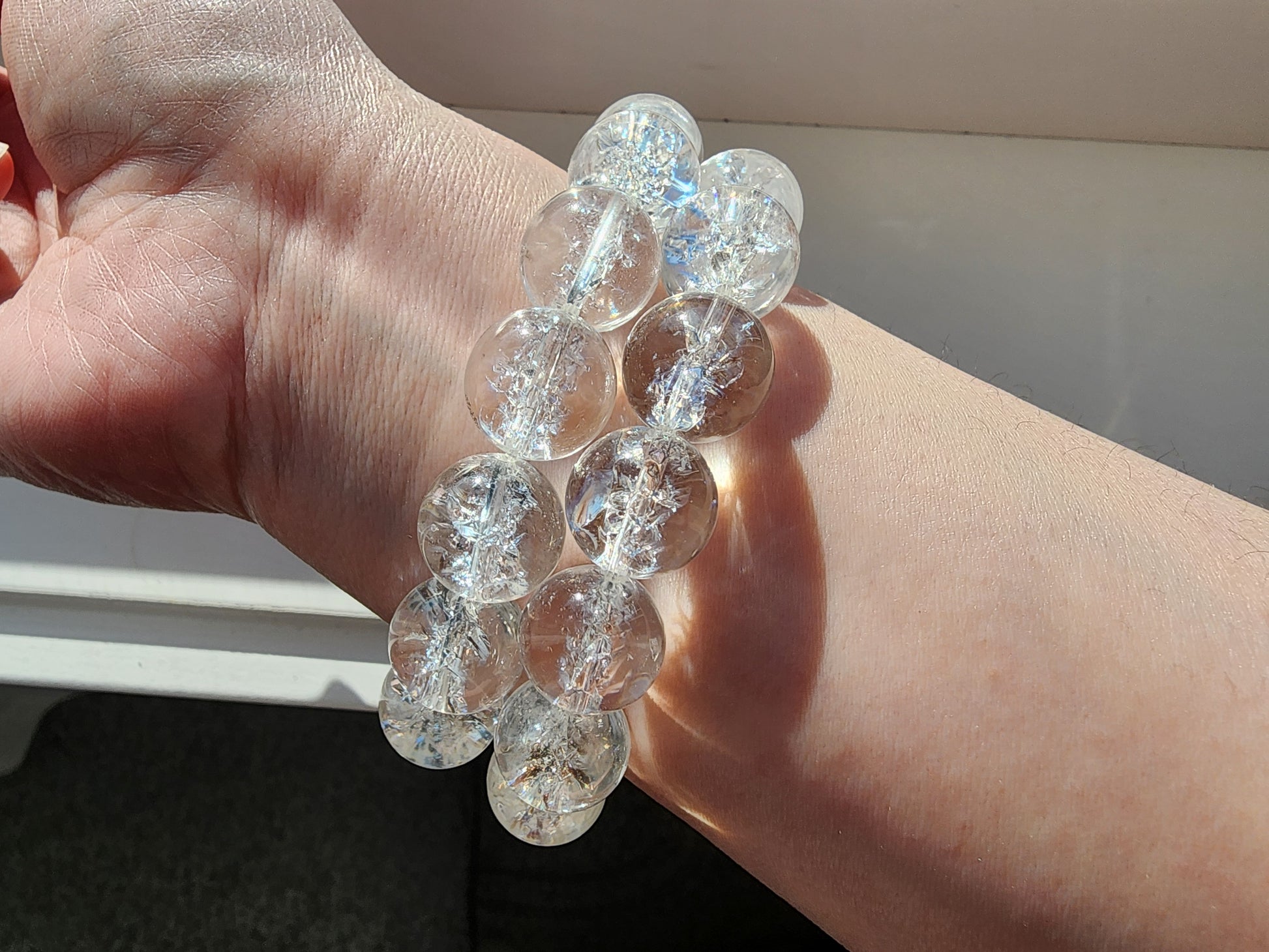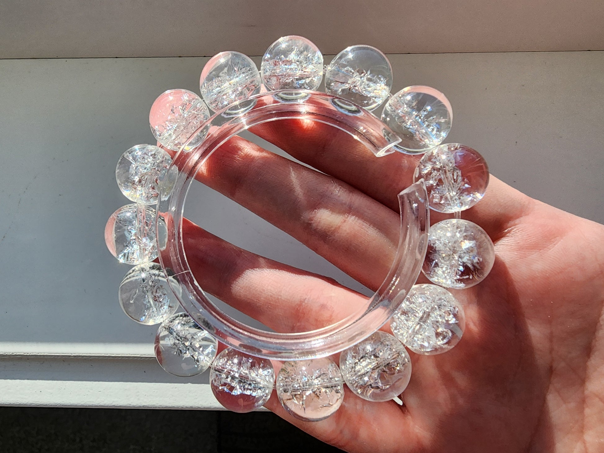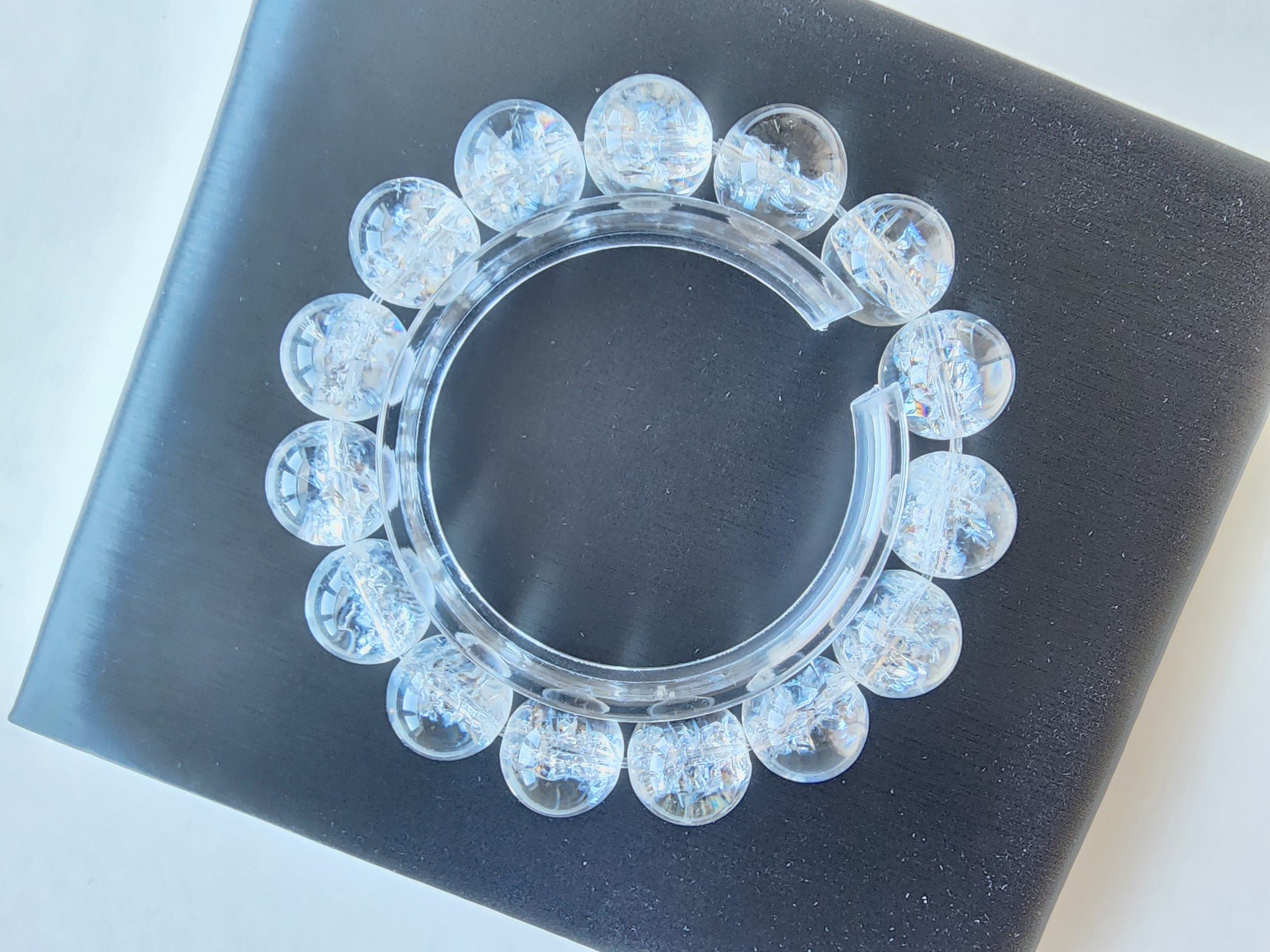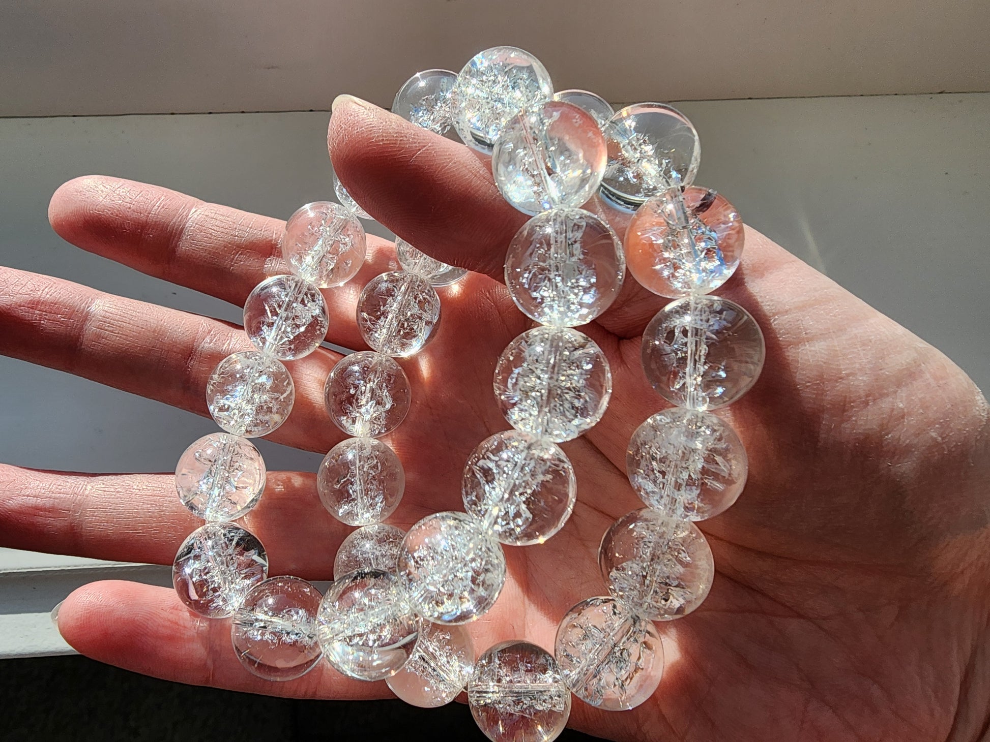 This bracelet is made with 13mm artificially exploded clear quartz beads. The unique process used to create these beads results in a beautiful, cracked appearance that is similar to natural clear quartz. However, due to the nature of the process, these beads may not be as strong as natural ones. Please handle with care to ensure the longevity of your bracelet. Thank you for understanding and we hope you enjoy this unique piece of jewelry!