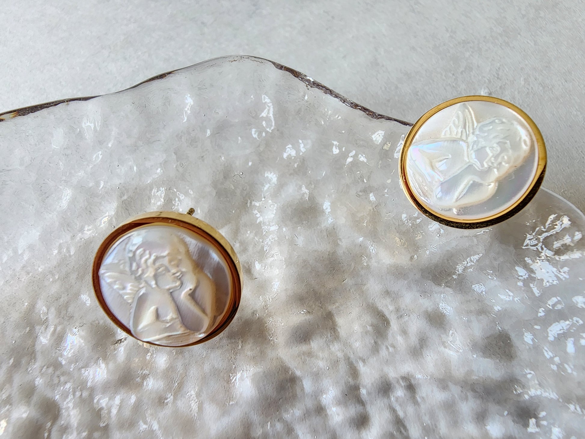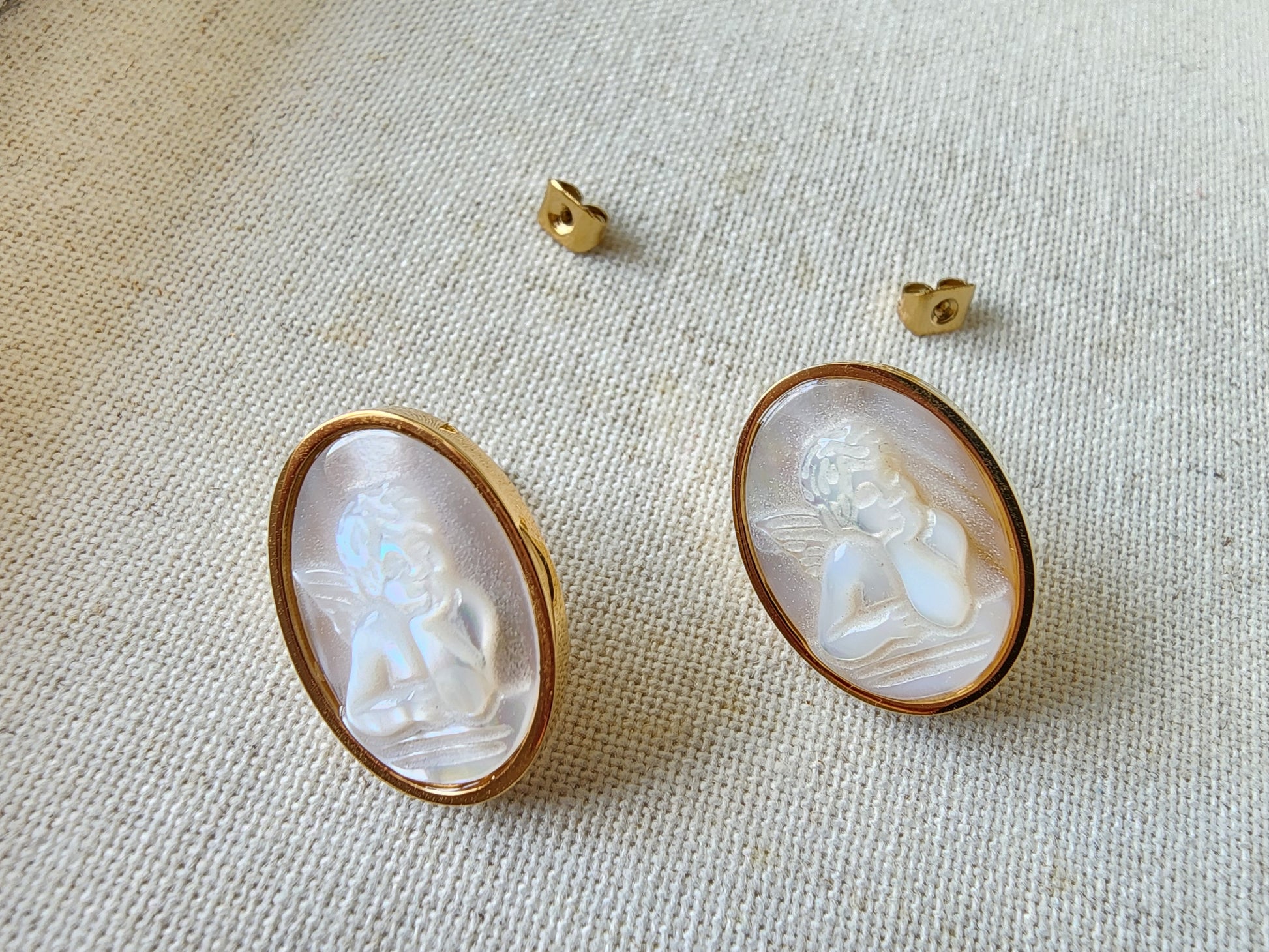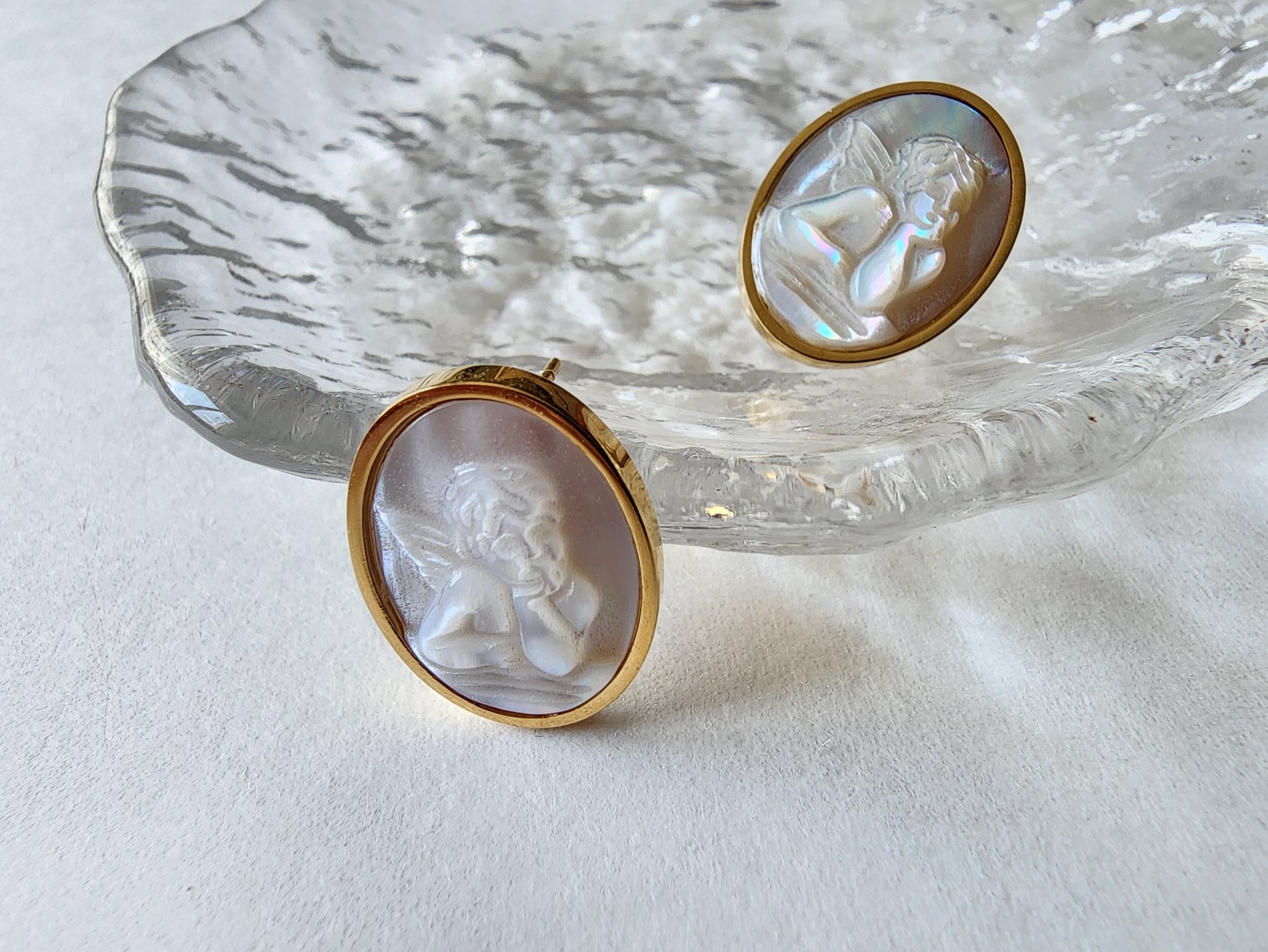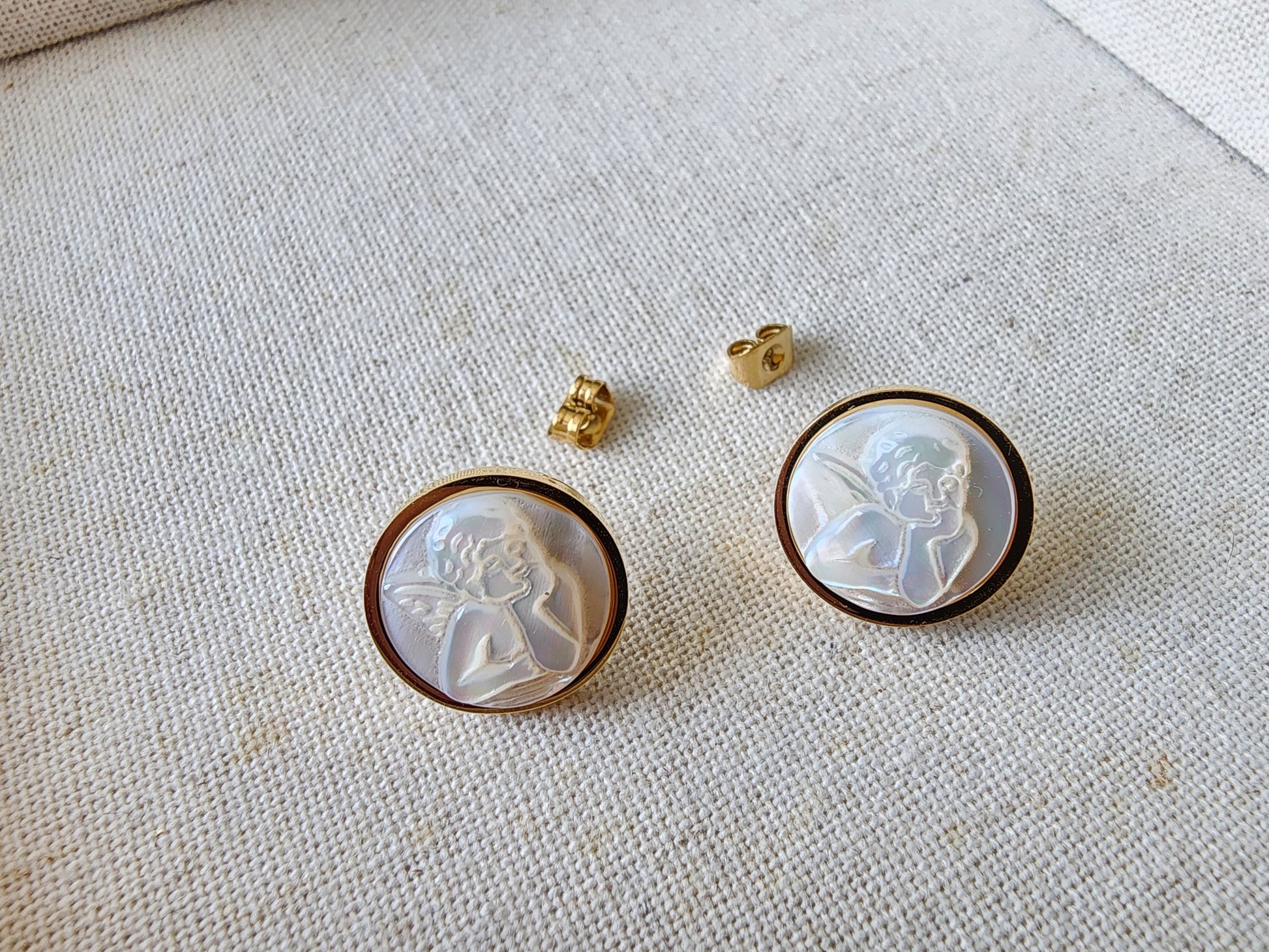 [Earrings] Angel Engraved Mother of Pearl Stud Earrings in Gold Plated Brass