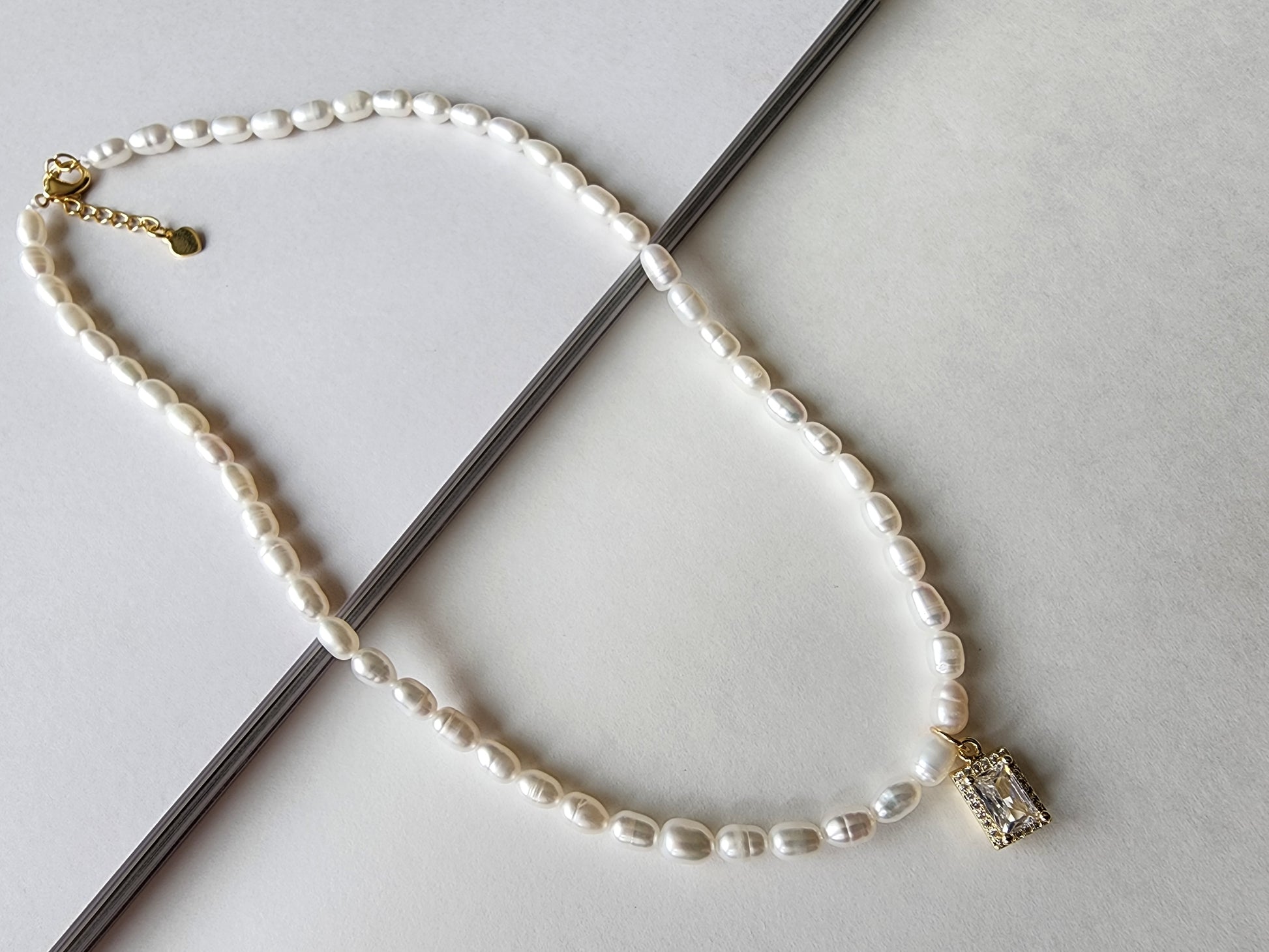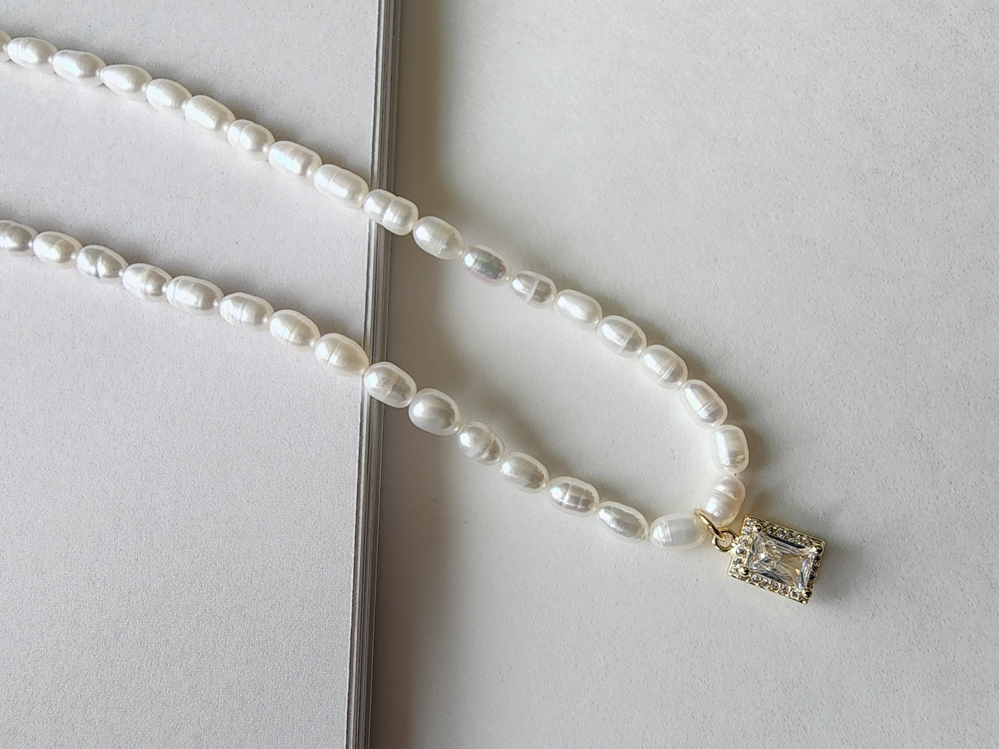 [Necklace] 14K Gold-Filled Millet-Shaped Freshwater Pearl Necklace with Rectangle Zirconia Pendant