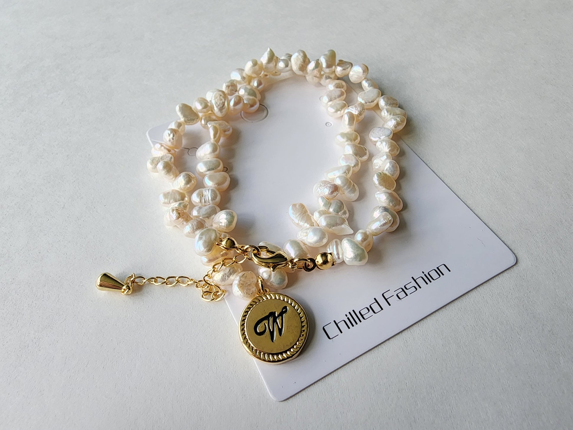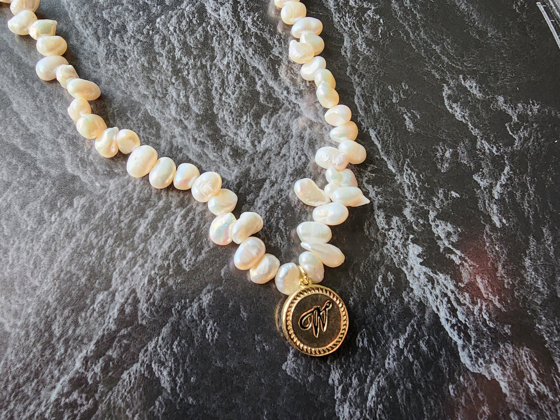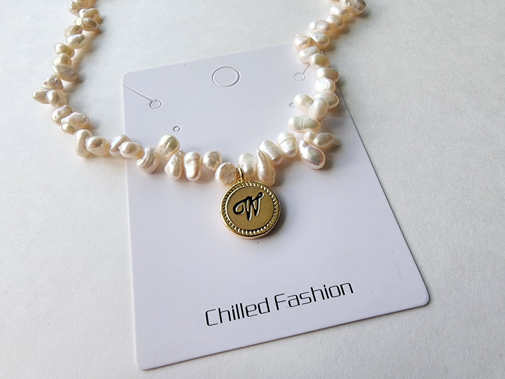 This exquisite necklace features a strand of delicate baroque pearls, carefully strung together to create a timeless and elegant look. At the center of the necklace hangs a circle pendant, adorned with the letter W in gold-plated brass. The combination of the lustrous pearls and the gleaming gold-plated brass creates a stunning contrast, making this necklace a truly unique and eye-catching piece. Perfect for dressing up any outfit, this necklace is sure to become a cherished addition to any jewelry collection.