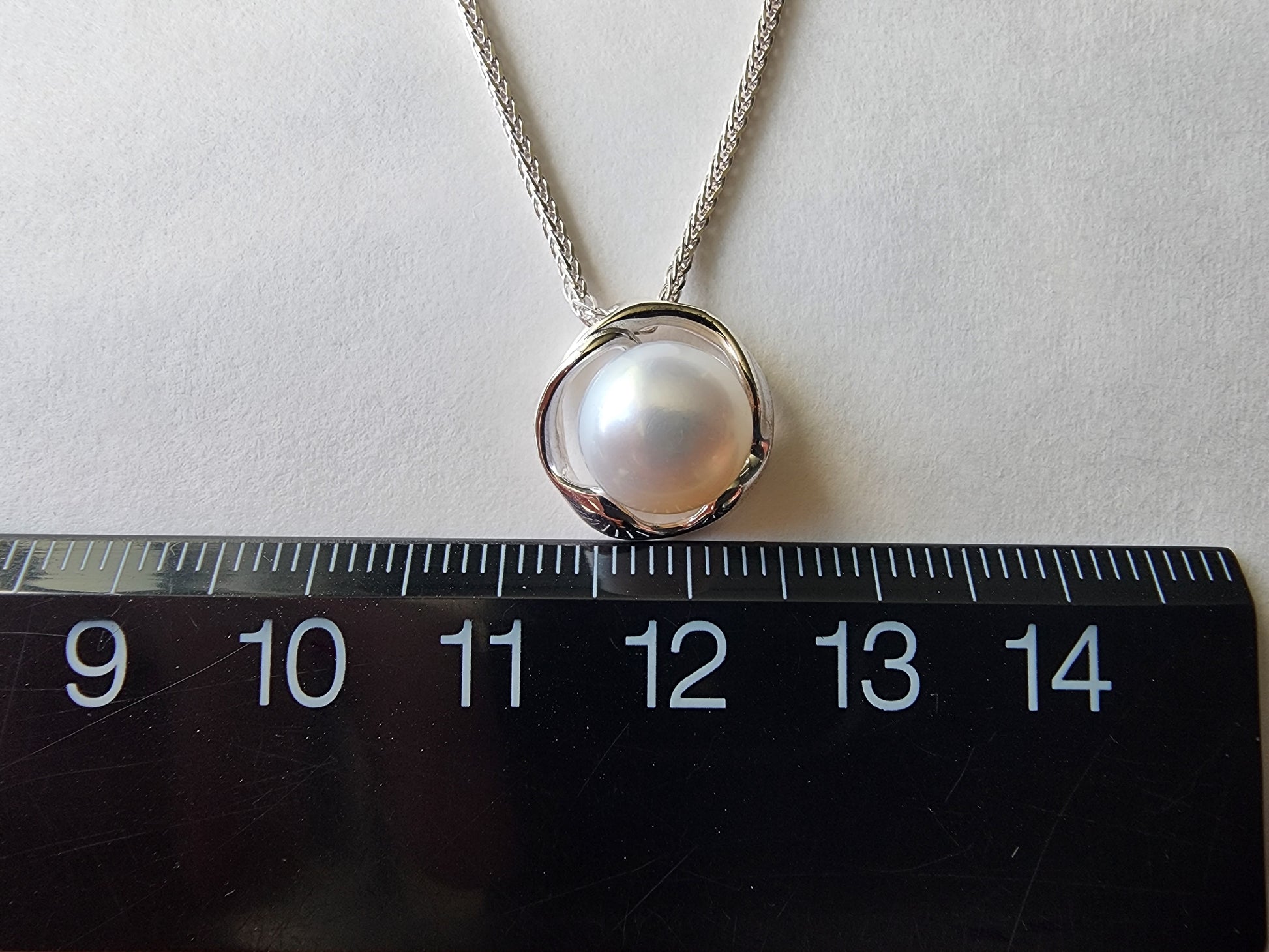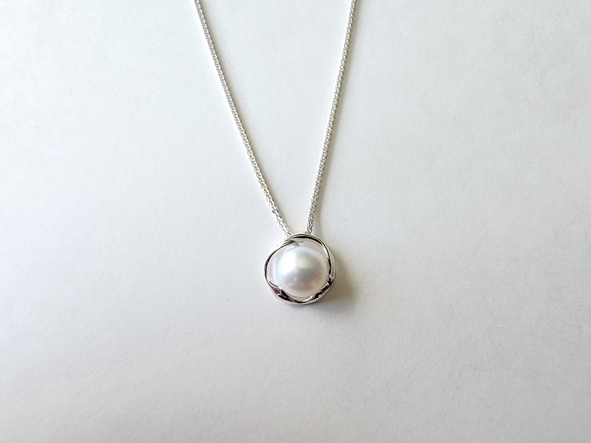 This exquisite necklace features a single, round freshwater pearl cradled in a simple sterling silver wire setting. The lustrous white pearl is the star of the piece, radiating a timeless beauty that makes this necklace suitable for any occasion. The pearl is delicately held by a sterling silver setting, known for its durability and quality, as indicated by the 925 silver mark. The necklace is completed with a thin, elegant silver chain. Whether it’s a gift for someone special or a treat for yourself, this necklace is a classic addition to any jewelry collection.