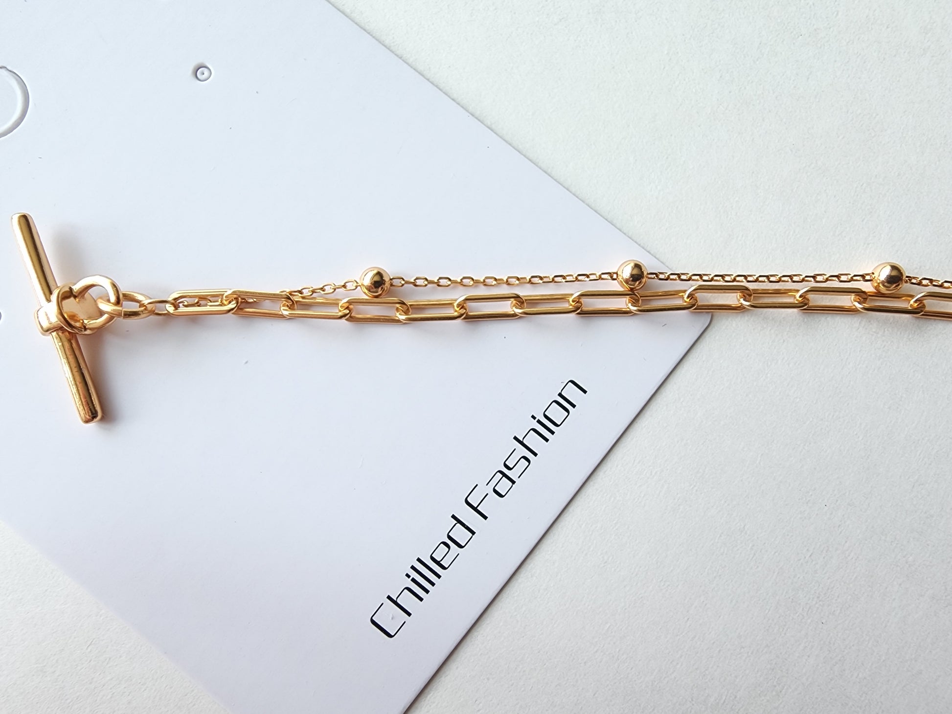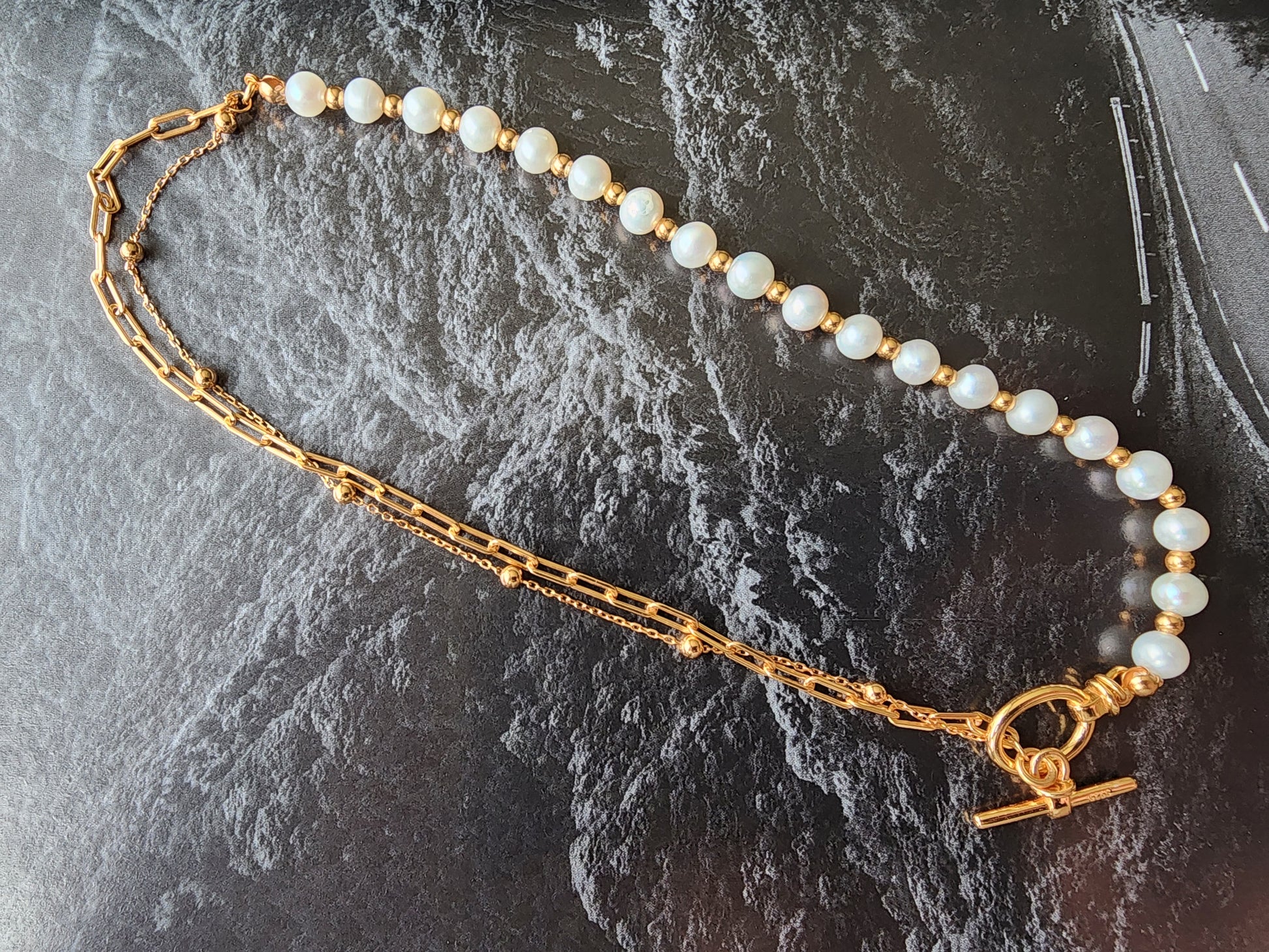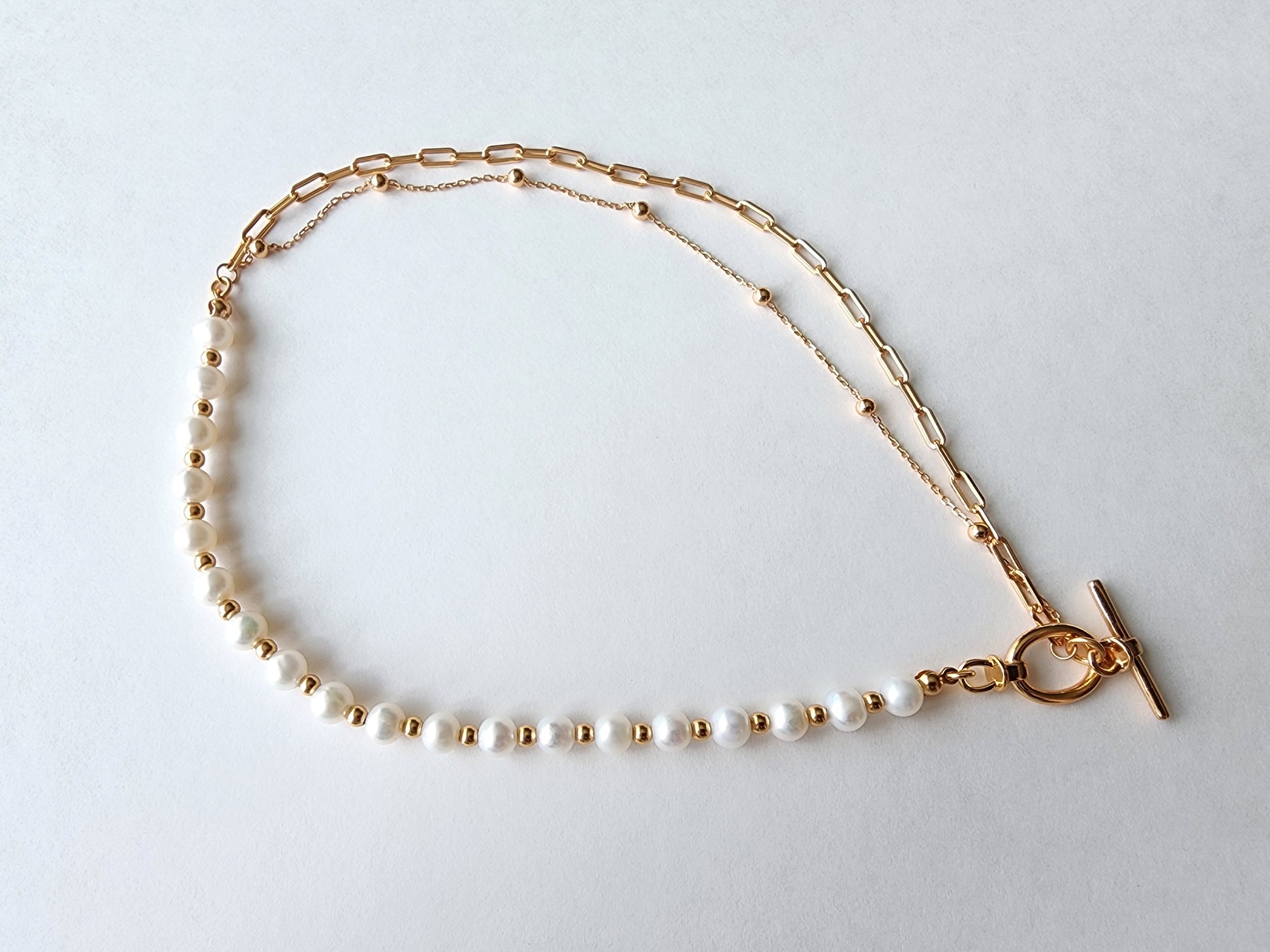This necklace features a unique design with half of the necklace made of 6mm freshwater pearls and the other half consisting of a double-layered sterling silver chain. One layer of the chain is a paperclip chain made of 925 silver, while the other layer is also made of 925 silver and features small sterling silver beads spaced evenly along the chain. The necklace is secured with a toggle clasp closure. This elegant piece is perfect for adding a touch of sophistication to any outfit.