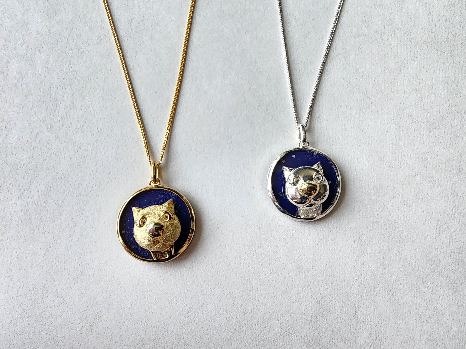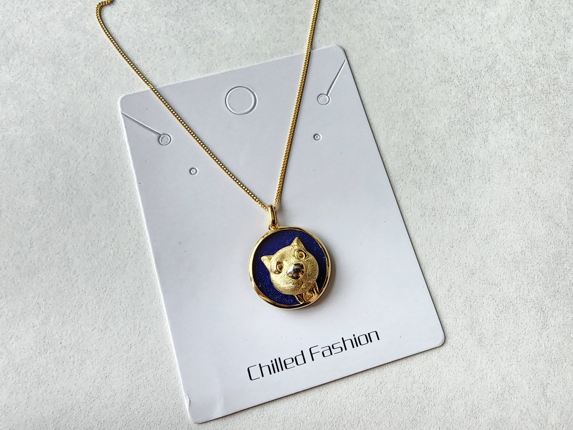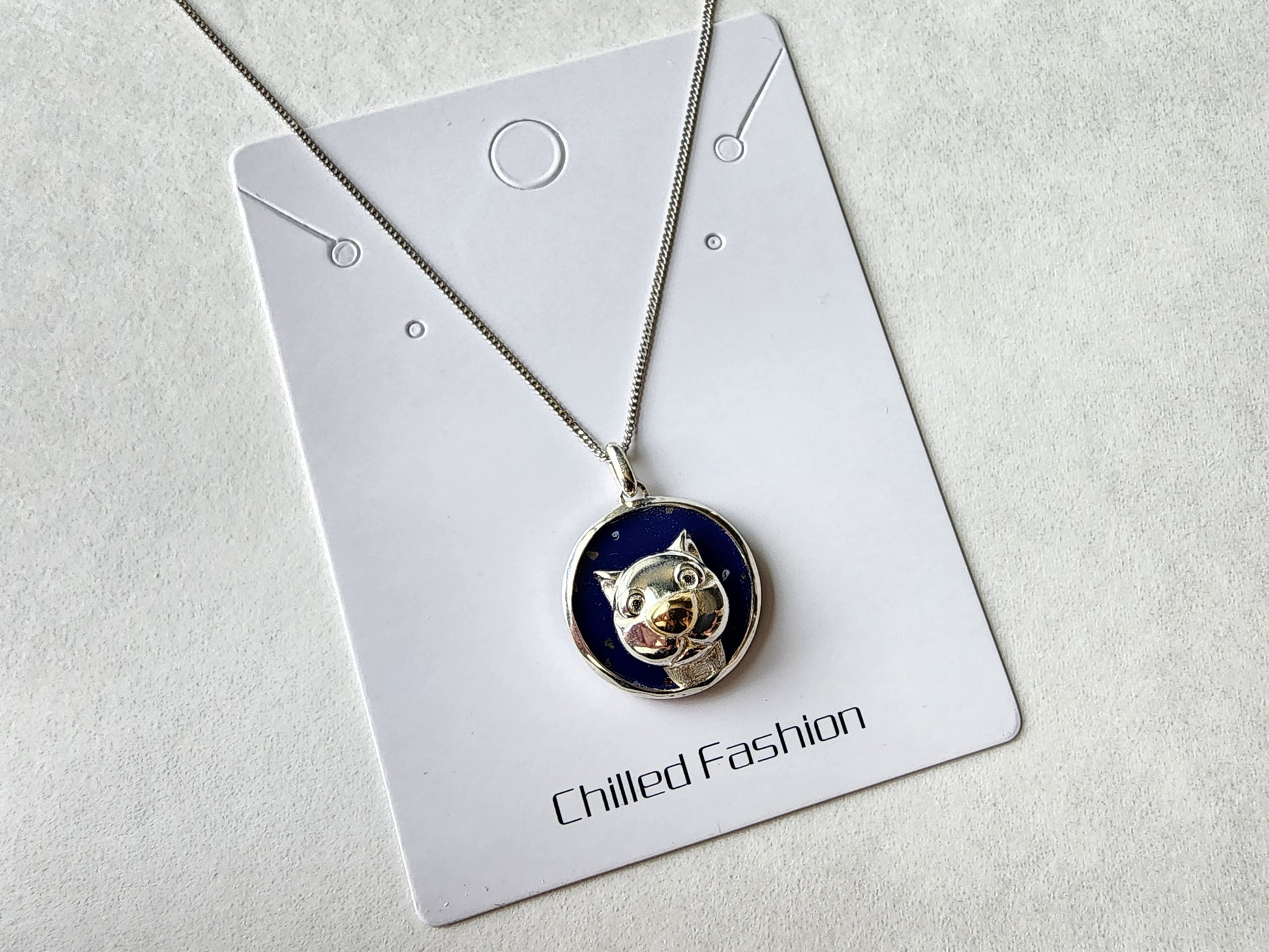 This beautiful necklace features a circular pendant with a cat’s head on it, taking a selfie. The pendant is adorned with artificial lapis lazuli, which has been designed with random spots that match the color of the necklace: silver for the silver version and gold for the gold version.