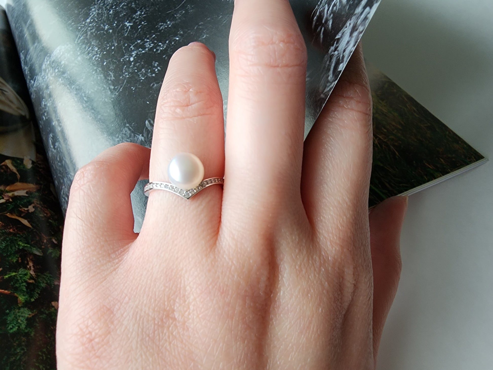 This elegant ring features a single 7-8mm button freshwater pearl set in the center of a V-shaped sterling silver (925 silver) band. The unique design of the band adds a modern touch to the classic beauty of the pearl. Perfect for any occasion, this ring is sure to become a cherished addition to any jewelry collection.